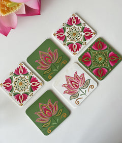 Bring elegance and serenity to your table with this Lotus Blossom Dot Mandala Coaster Set. Hand-painted on a white base, the design features intricate lotus-inspired motifs in vibrant pink, green, and golden accents, beautifully arranged in a dot mandala pattern.