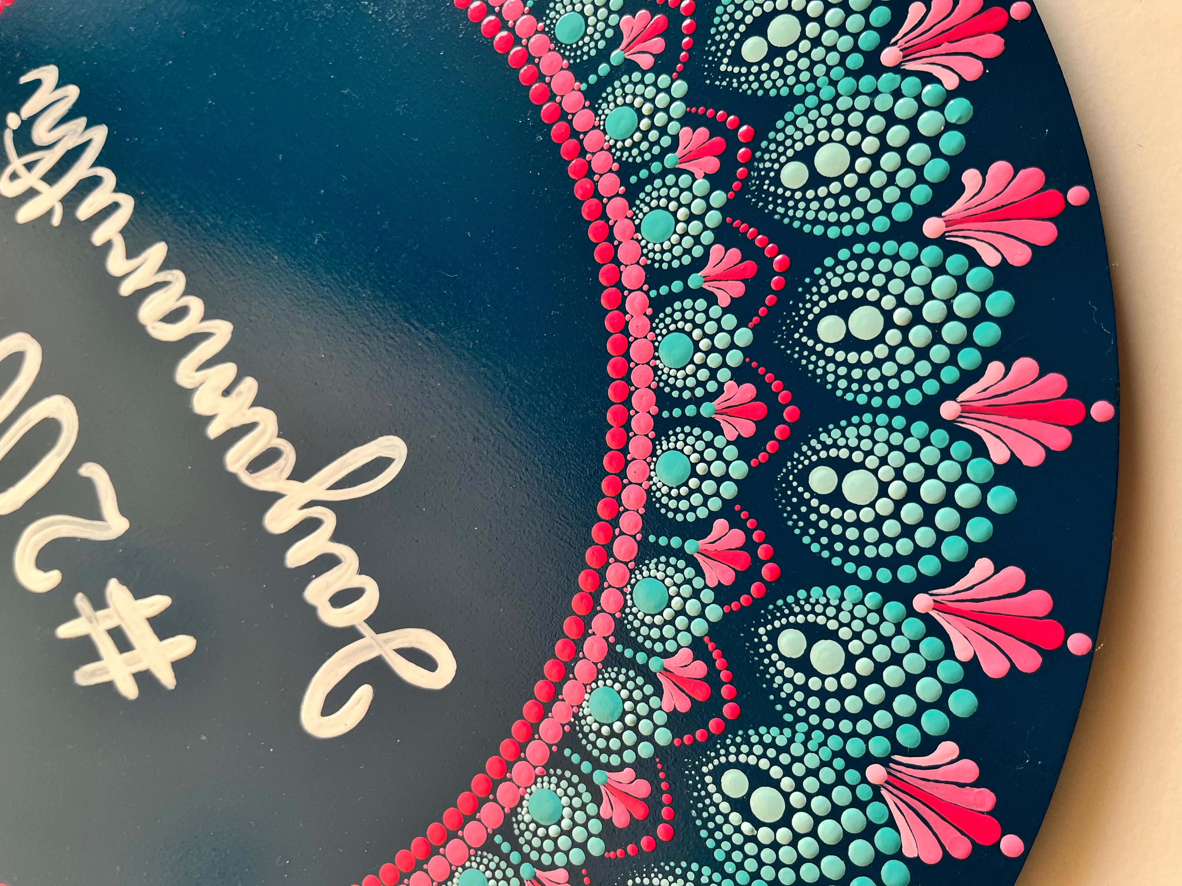 Turquoise & Pink Dot Mandala Round Nameplate – 16" – Hand-painted Personalized Door/Wall Sign