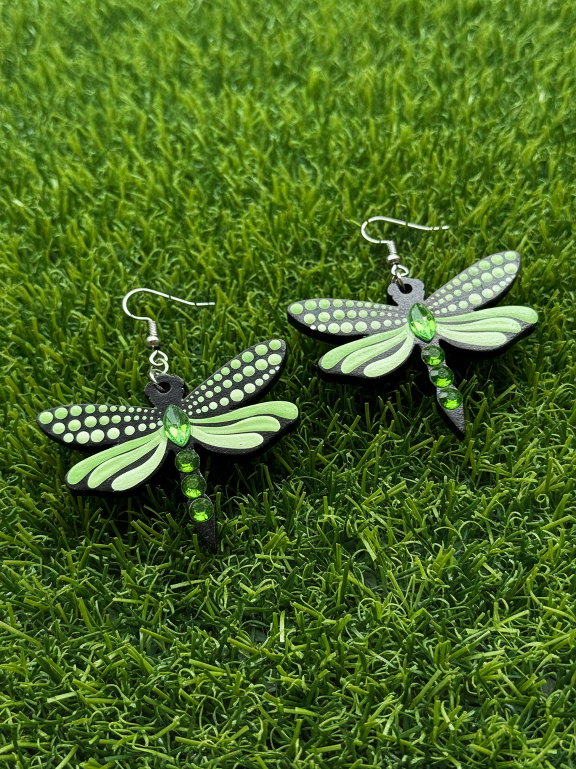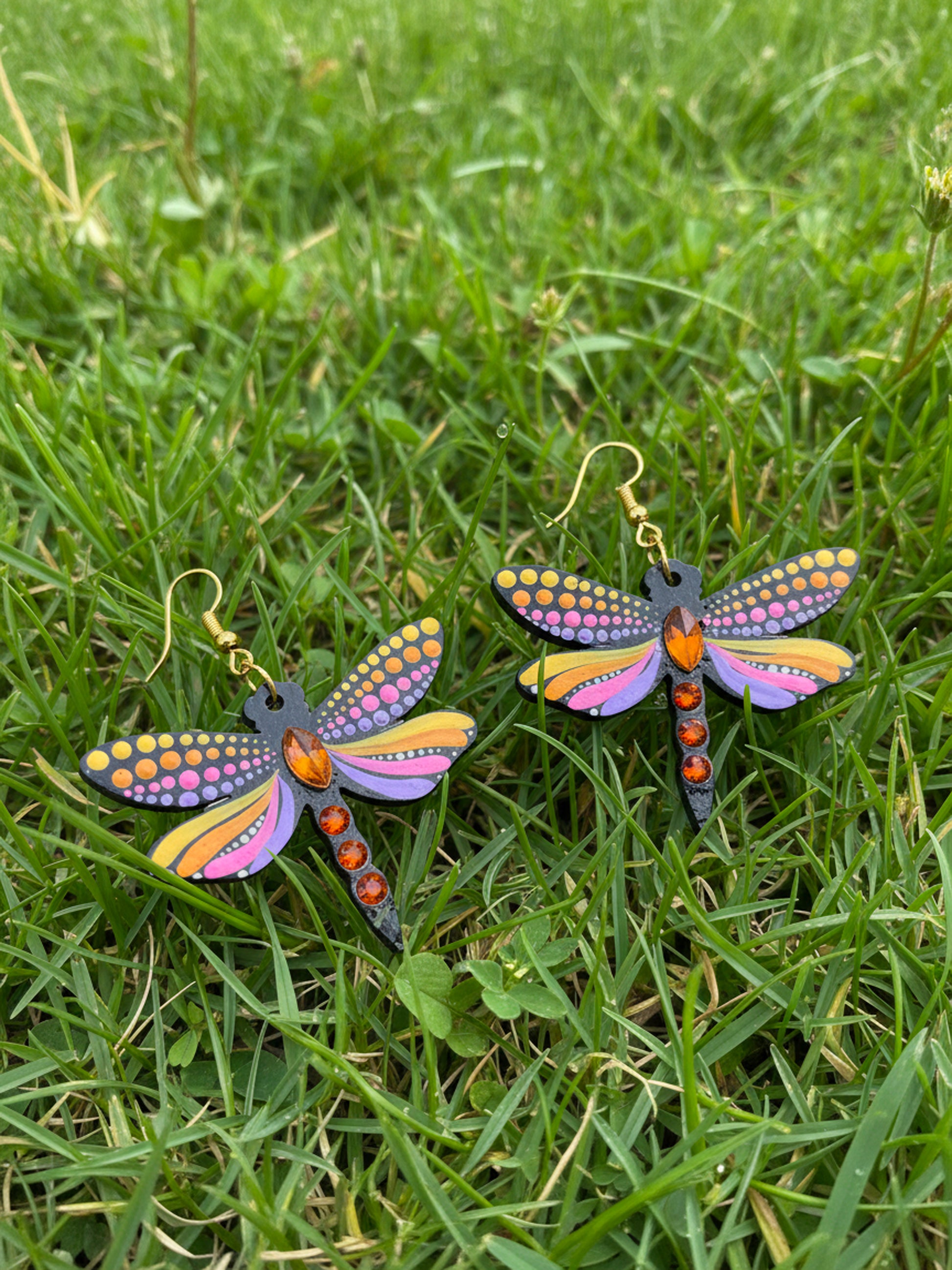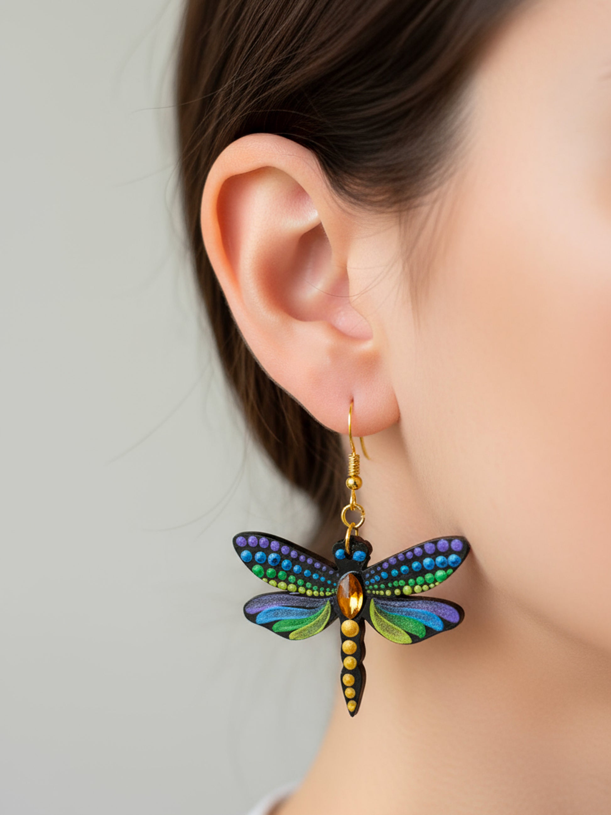 Hand-painted in mesmerizing peacock shades of emerald green, turquoise blue, violet, and gold, each dragonfly is detailed with intricate dot mandala patterns that shimmer beautifully with every movement.