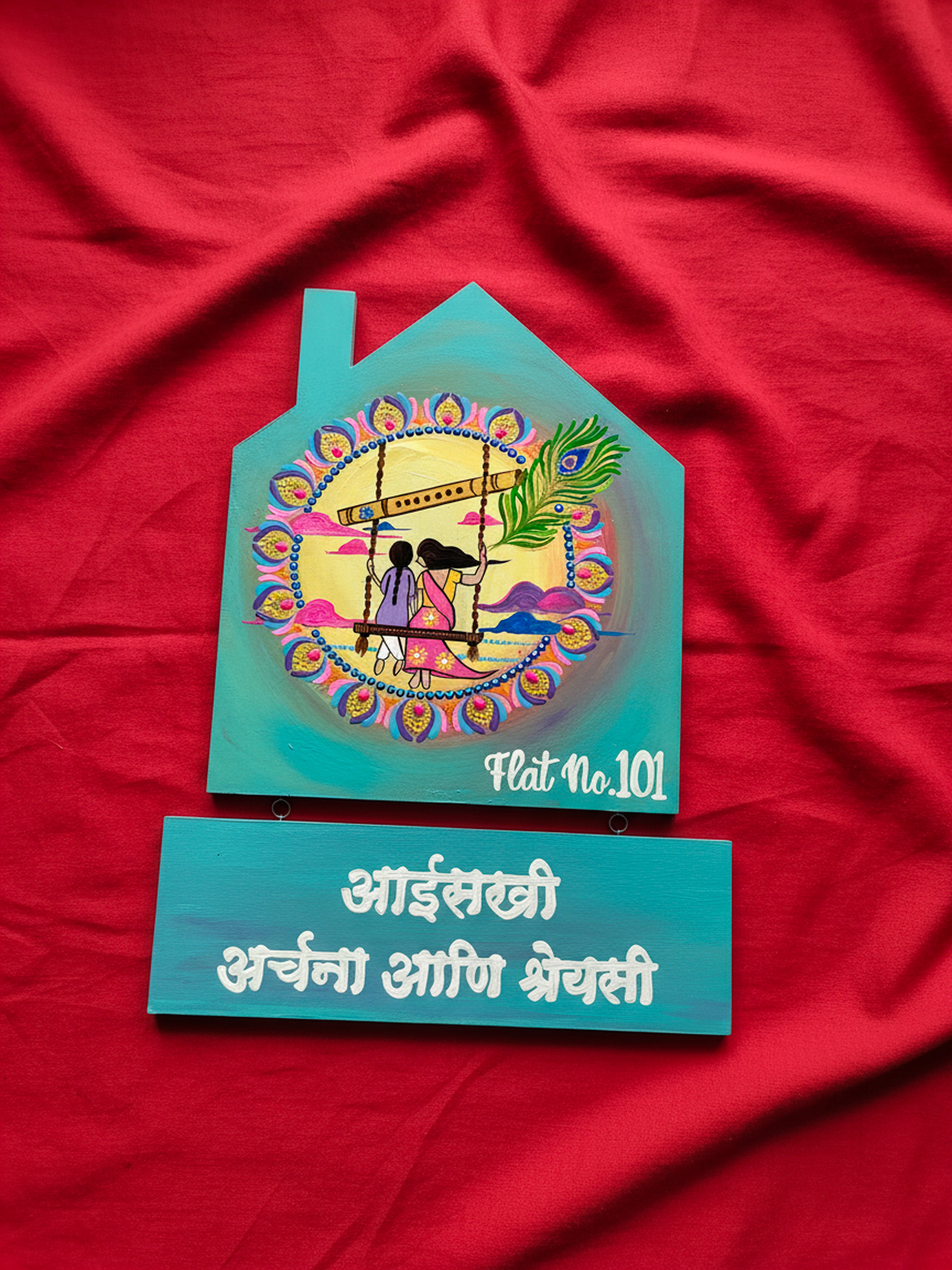 Surrounded by vibrant mandala patterns, a Krishna flute, and a delicate peacock feather, it radiates positivity, love, and cultural charm. The design captures not just an entrance sign, but a meaningful story of togetherness and blessings.