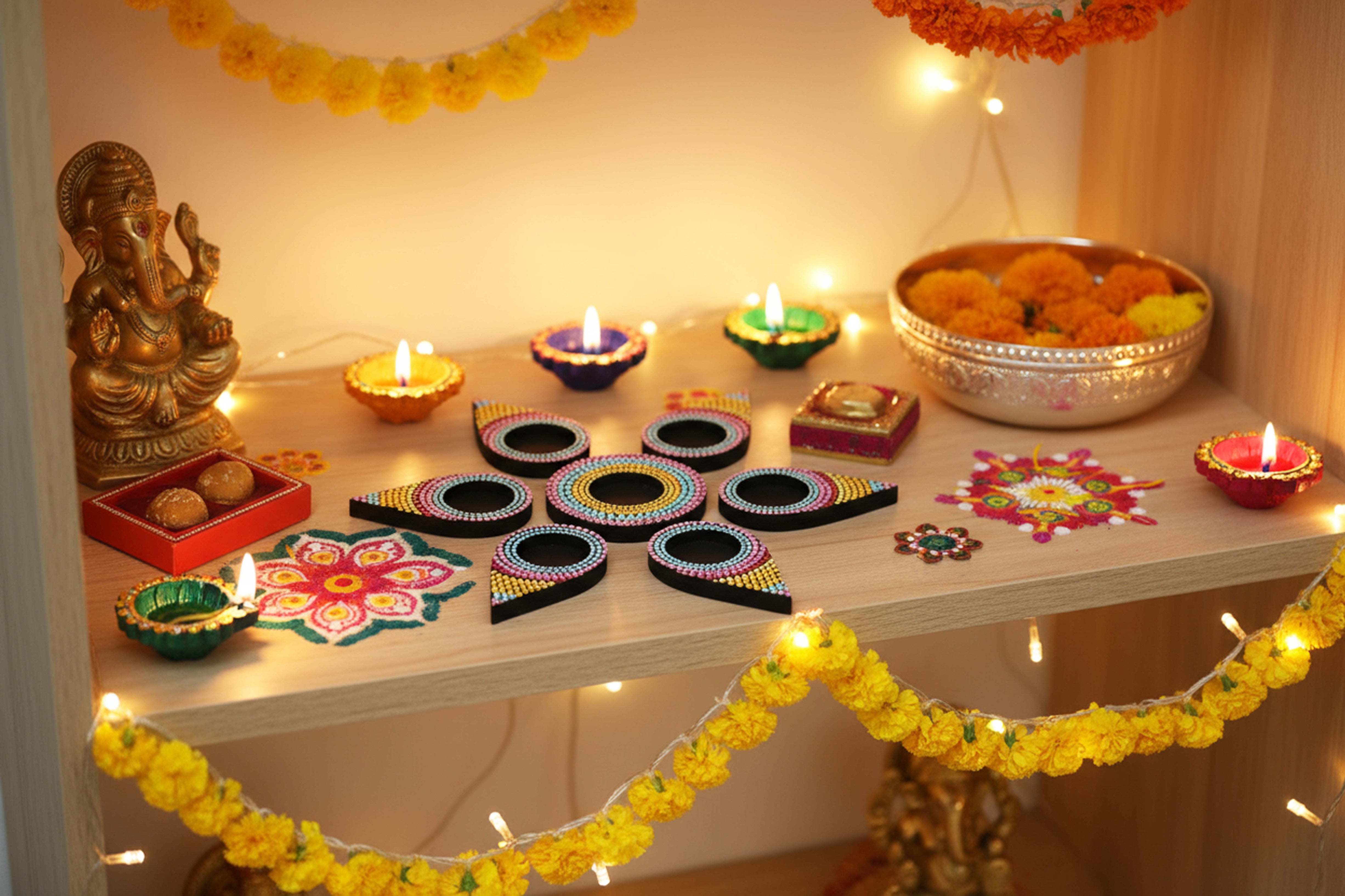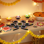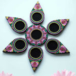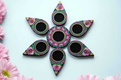 Illuminate your festive celebrations with this Hand-Painted Dot Mandala Tealight Holder Set, beautifully crafted in shades of pink, green, and gold. Each diya is adorned with delicate mandala dot art and floral motifs, blending tradition with contemporary elegance. Perfect for Diwali, Pooja rituals, or home decor, these wooden diyas bring warmth, positivity, and charm to any space.