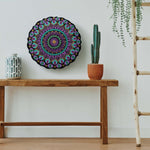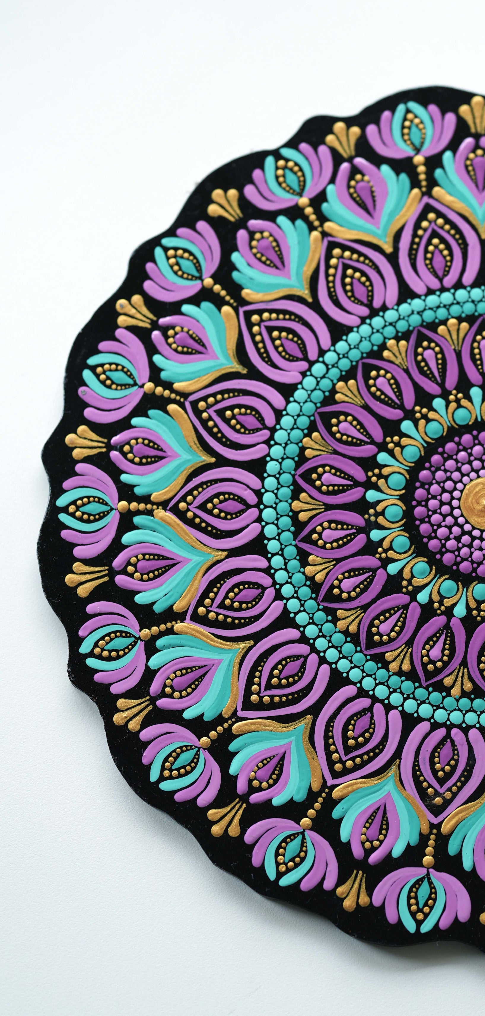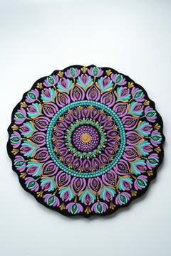 This exquisite hand-painted mandala wall plate features a stunning combination of purple, teal, and golden accents on a black base, creating a bold yet soothing contrast. Every detail is carefully crafted using the dot art technique, forming layered lotus-inspired petals that radiate harmony and balance.
