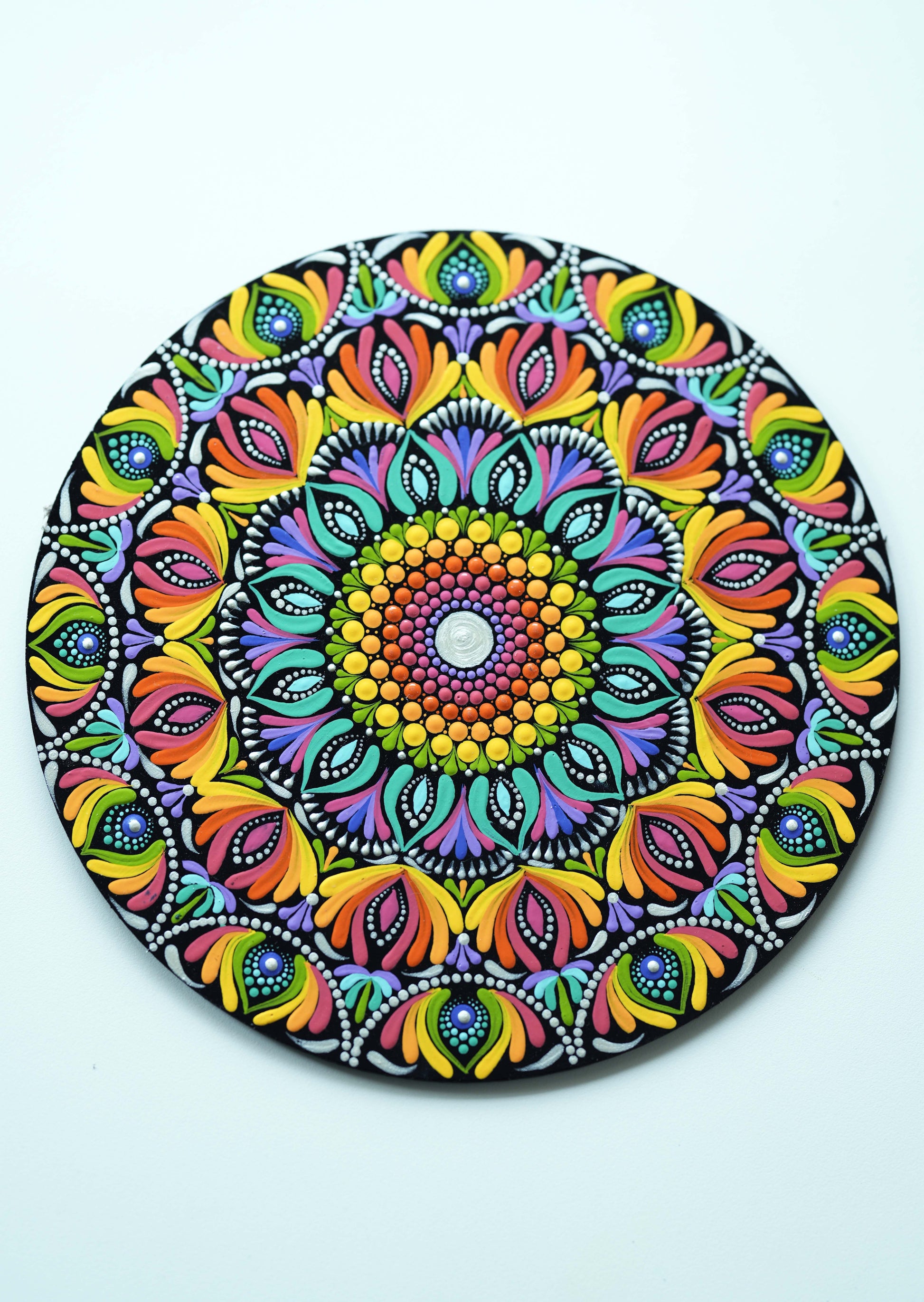 Each dot and brushstroke is meticulously hand-painted, resulting in a one-of-a-kind artwork that symbolizes creativity, vibrancy, and balance. Perfect as a wall accent for living rooms, meditation corners, or as a thoughtful gift for art lovers and spiritual souls, this colorful mandala brings life and warmth wherever it is placed.