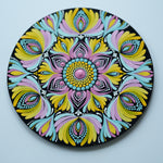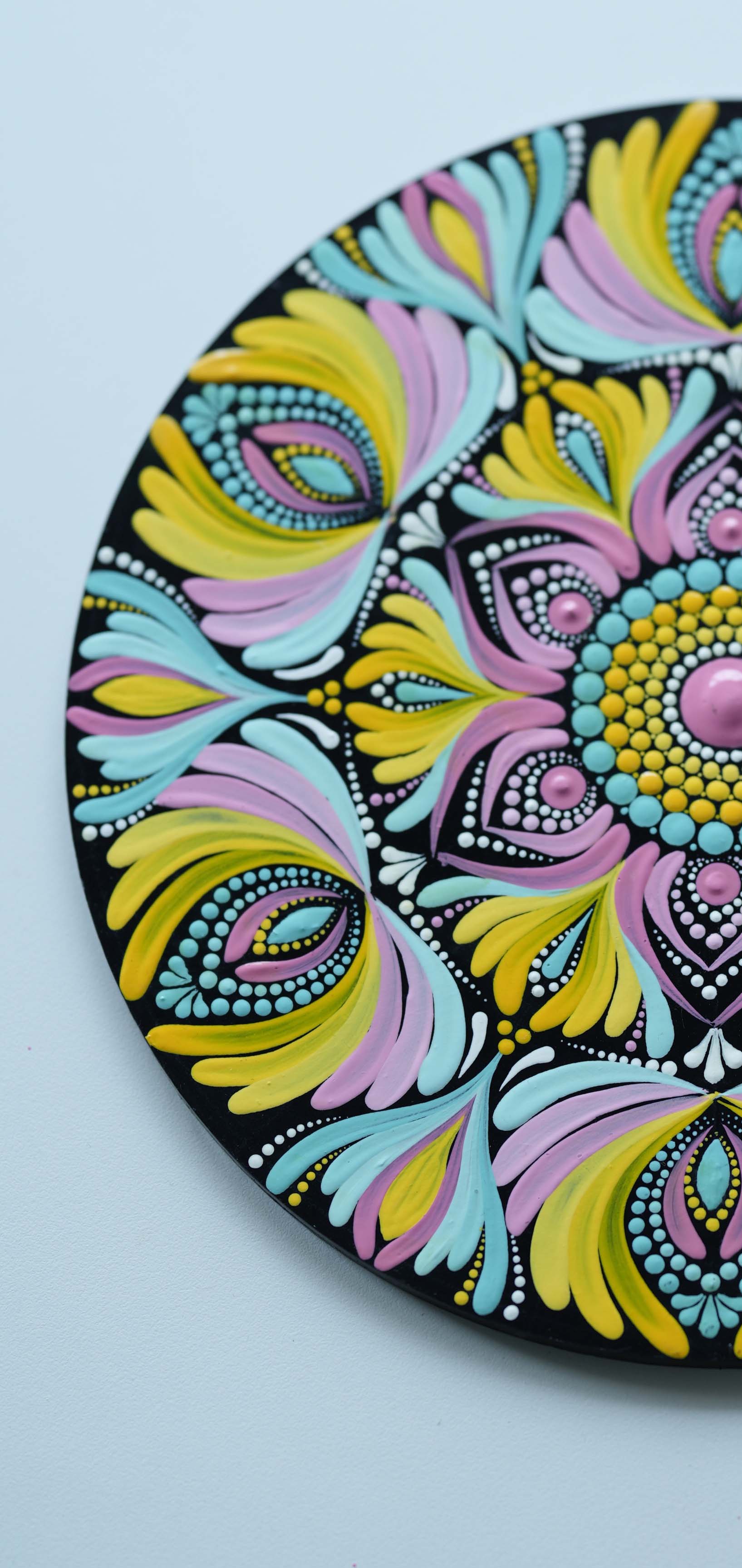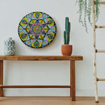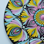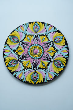 Bring the joy of colors into your space with this Radiant Floral Mandala Wall Plate, a hand-painted masterpiece that blends tradition with vibrancy. Crafted on a sturdy MDF wooden base, this artwork features a stunning combination of yellow, pink, blue, and black in intricate dot and brushstroke mandala patterns.