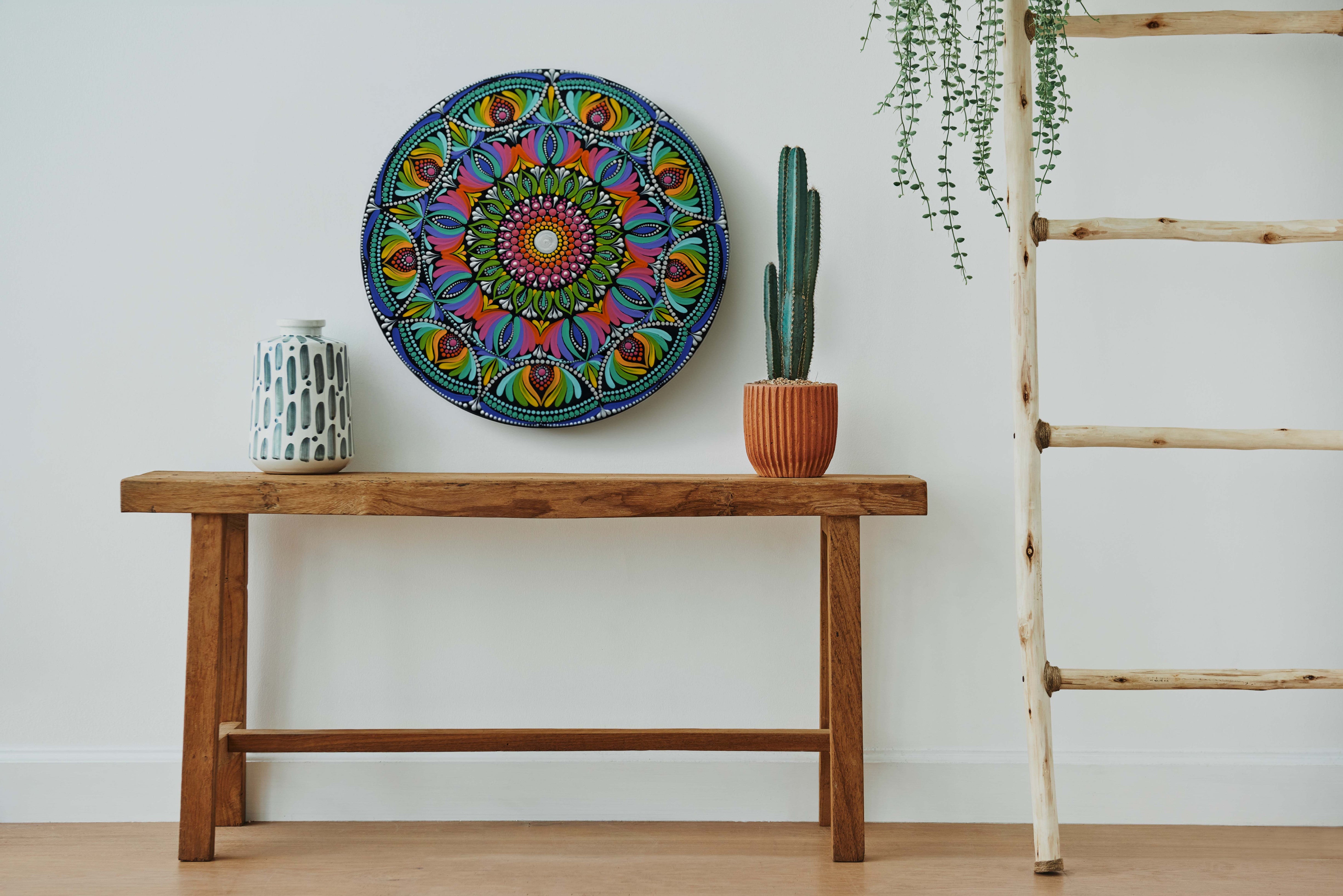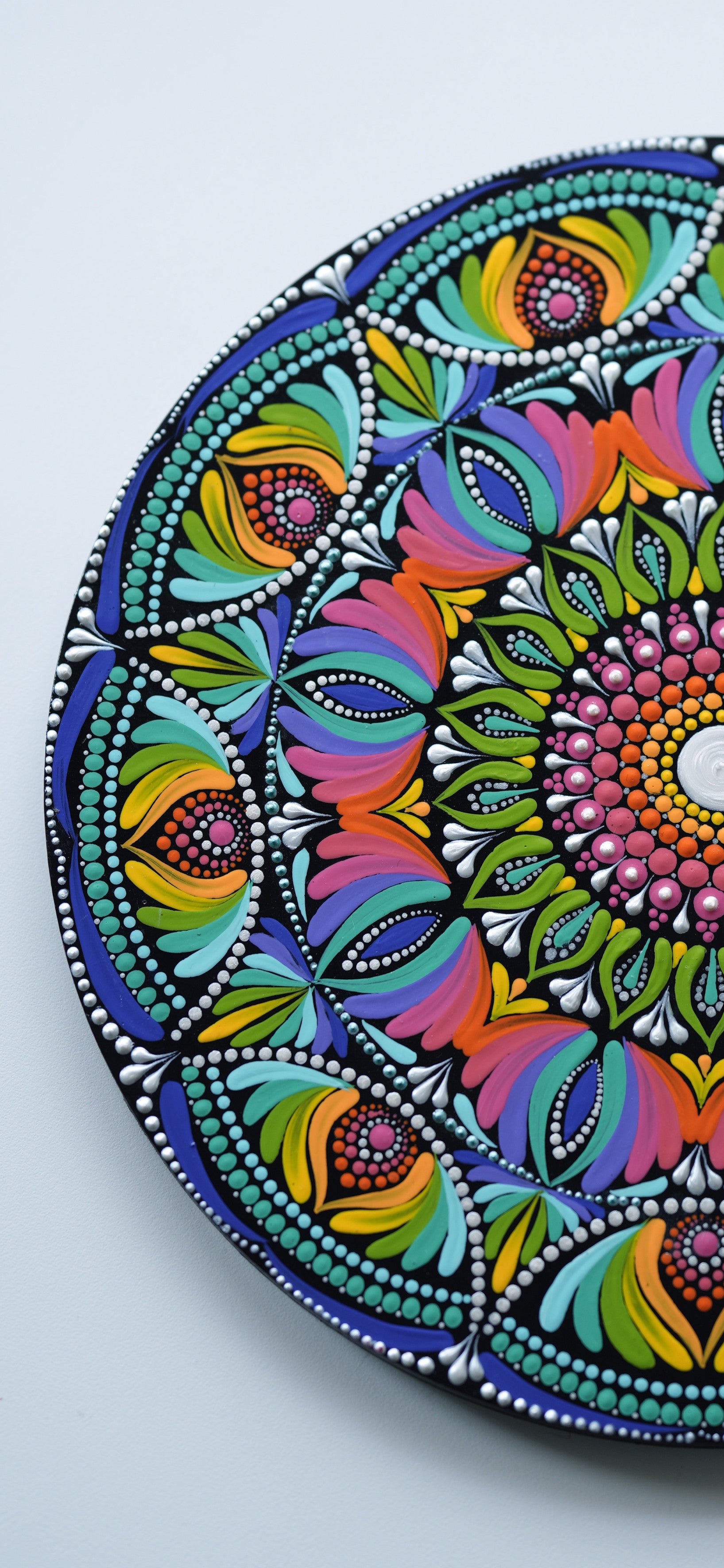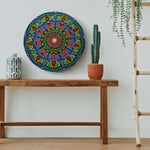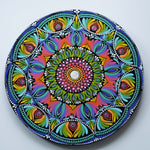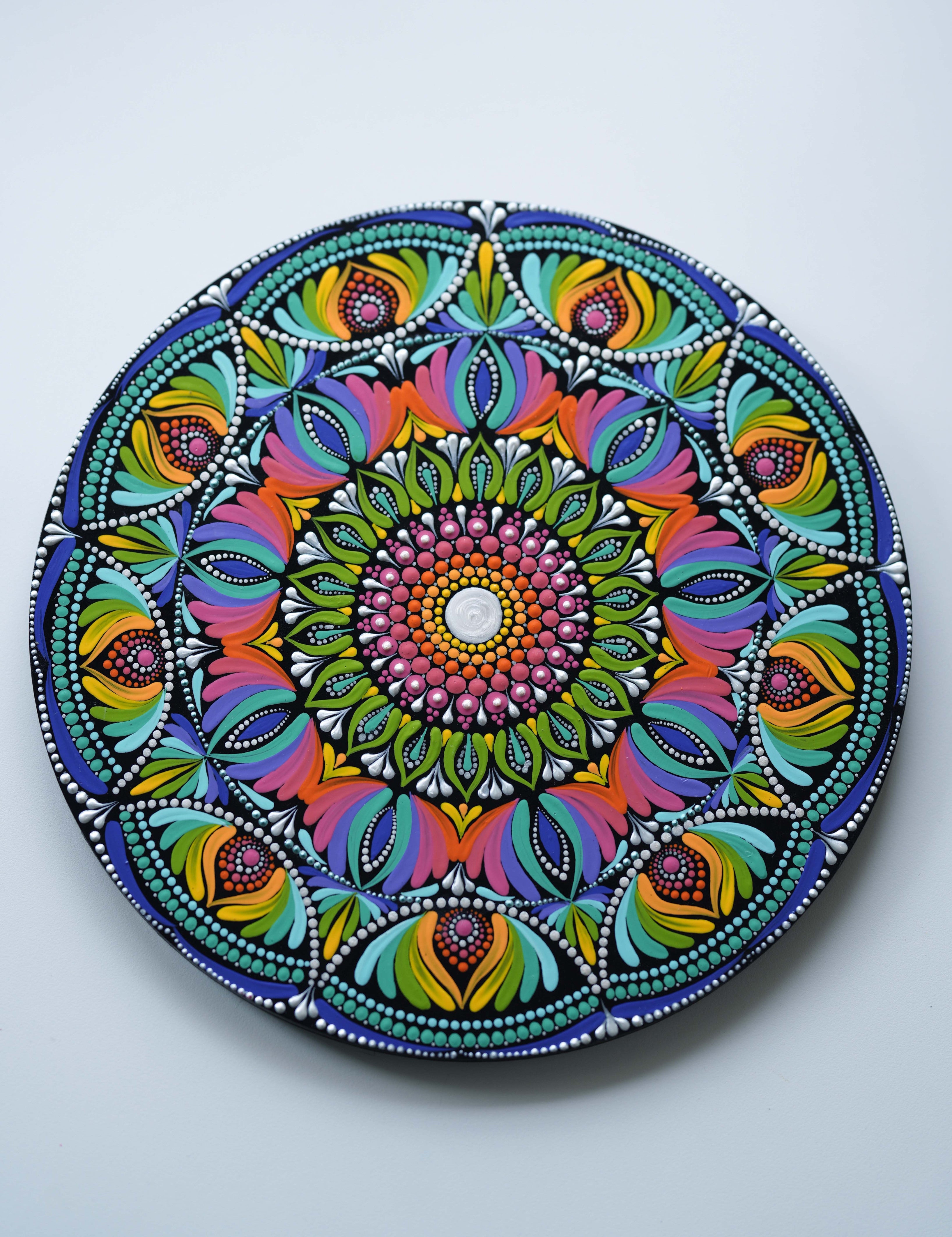 This stunning hand-painted mandala wall plate bursts with vibrant energy and intricate detailing. Created using the traditional dot art technique, every layer radiates outward in a harmonious blend of colors – pinks, greens, yellows, purples, and blues. The circular design symbolizes balance and unity, while the precise patterns bring a sense of movement and joy. Perfect as a statement wall décor piece, this artwork adds positivity, vibrancy, and a unique artistic touch to any living space.