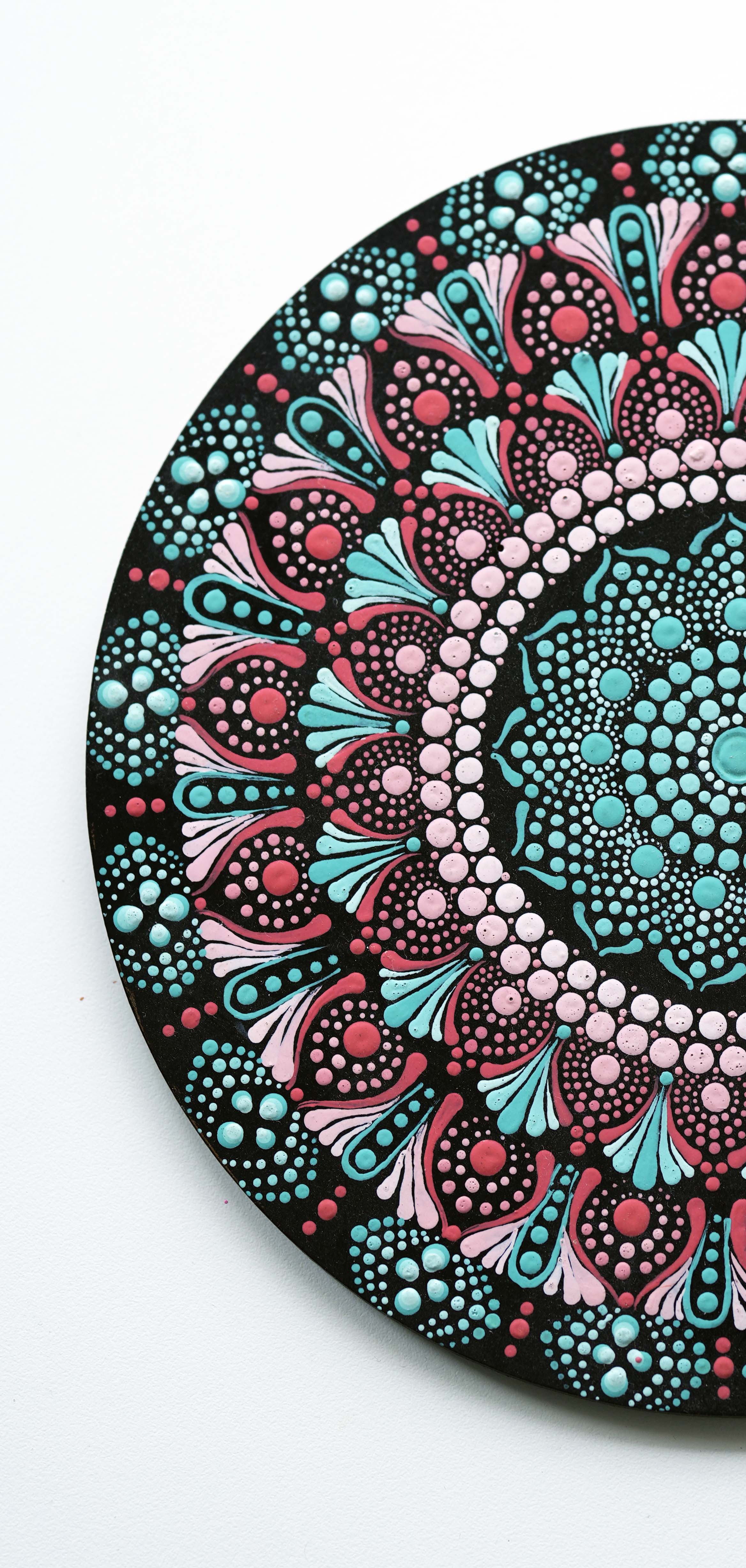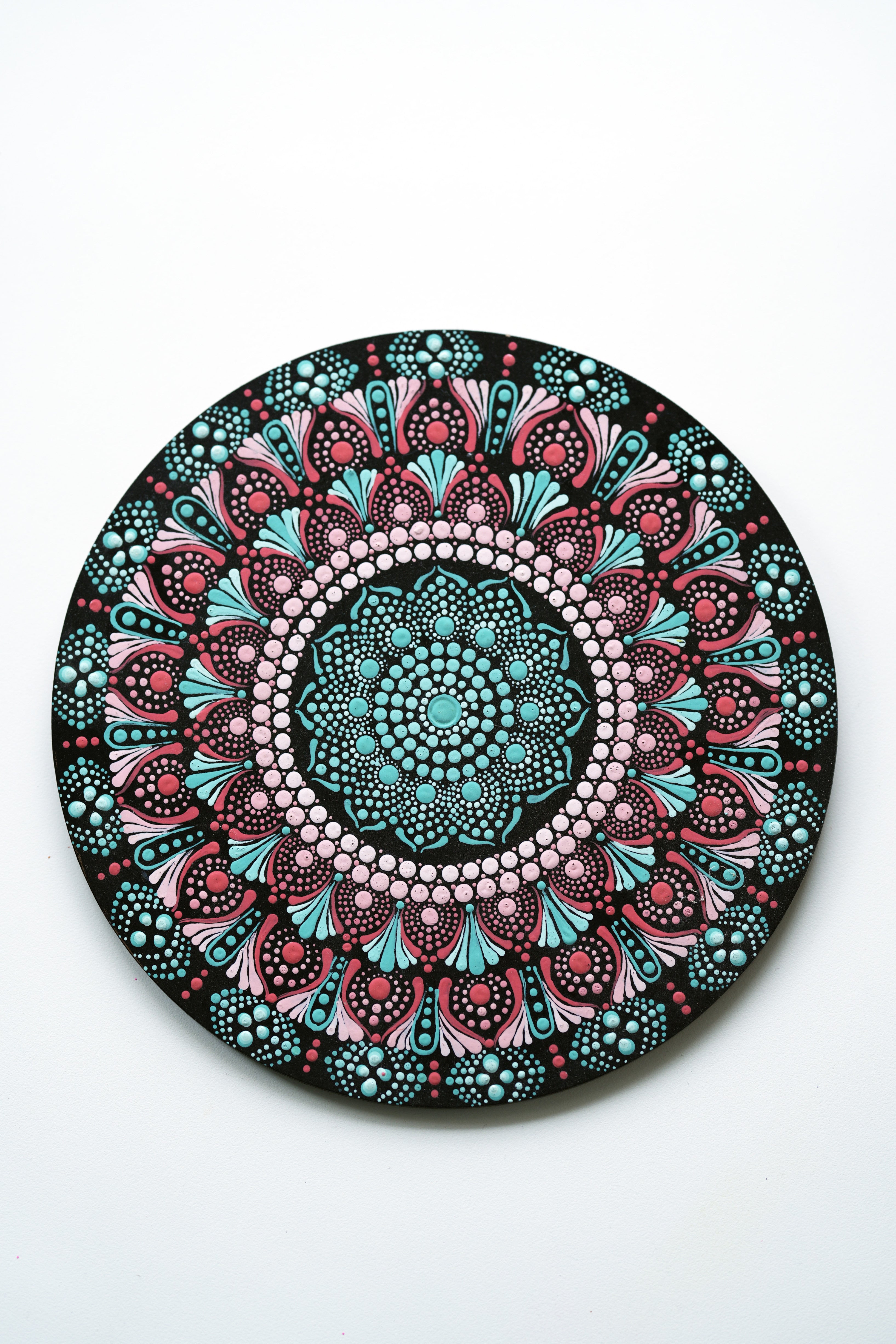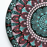 This stunning hand-painted mandala wall plate is a vibrant piece of art created on MDF wood using the dotting technique. Designed in soothing shades of pink, teal blue, and red against a deep black background, the intricate details radiate balance, harmony, and elegance. Every dot and stroke has been meticulously placed to form mesmerizing circular patterns that symbolize infinity, wholeness, and inner peace.