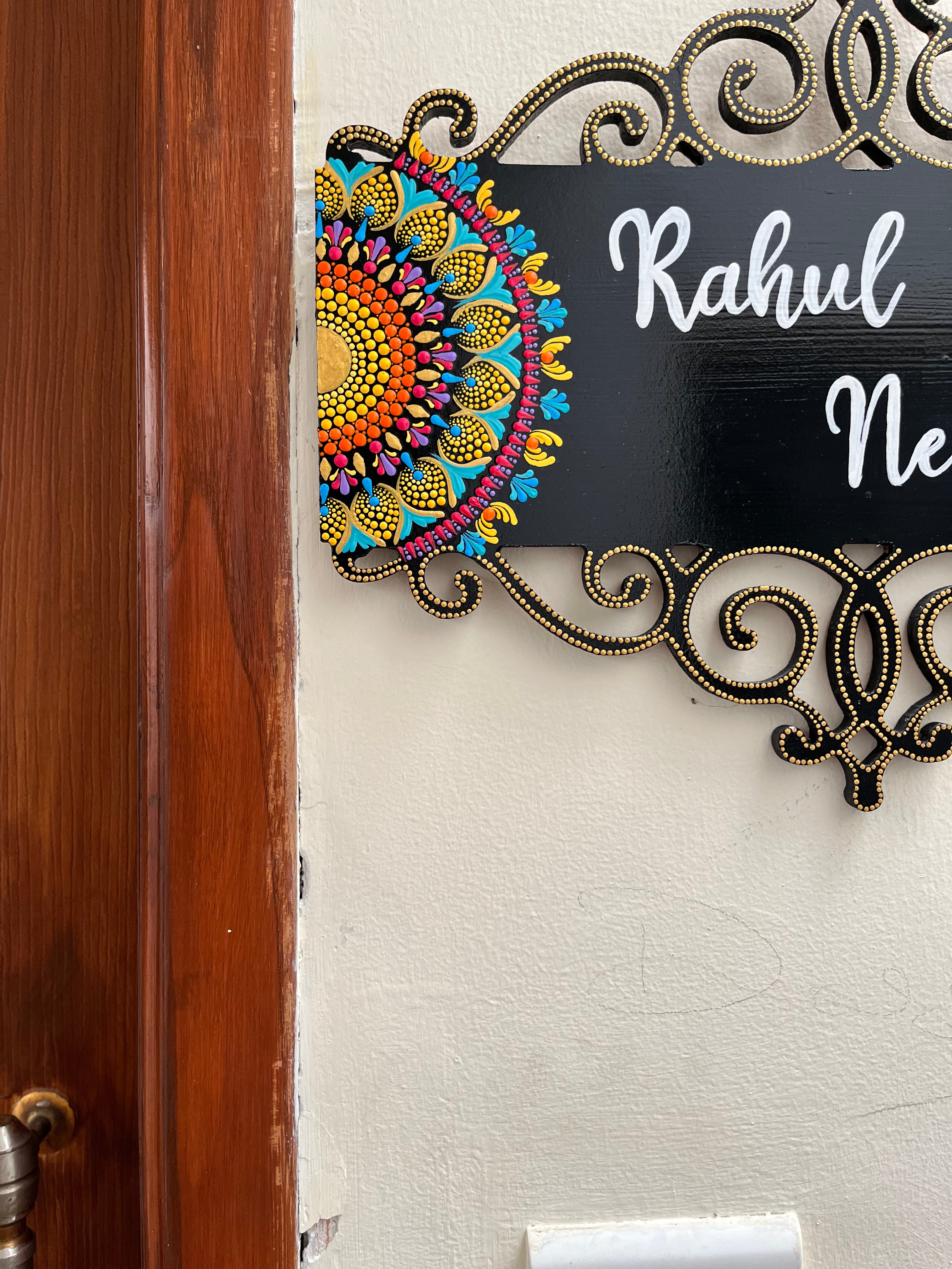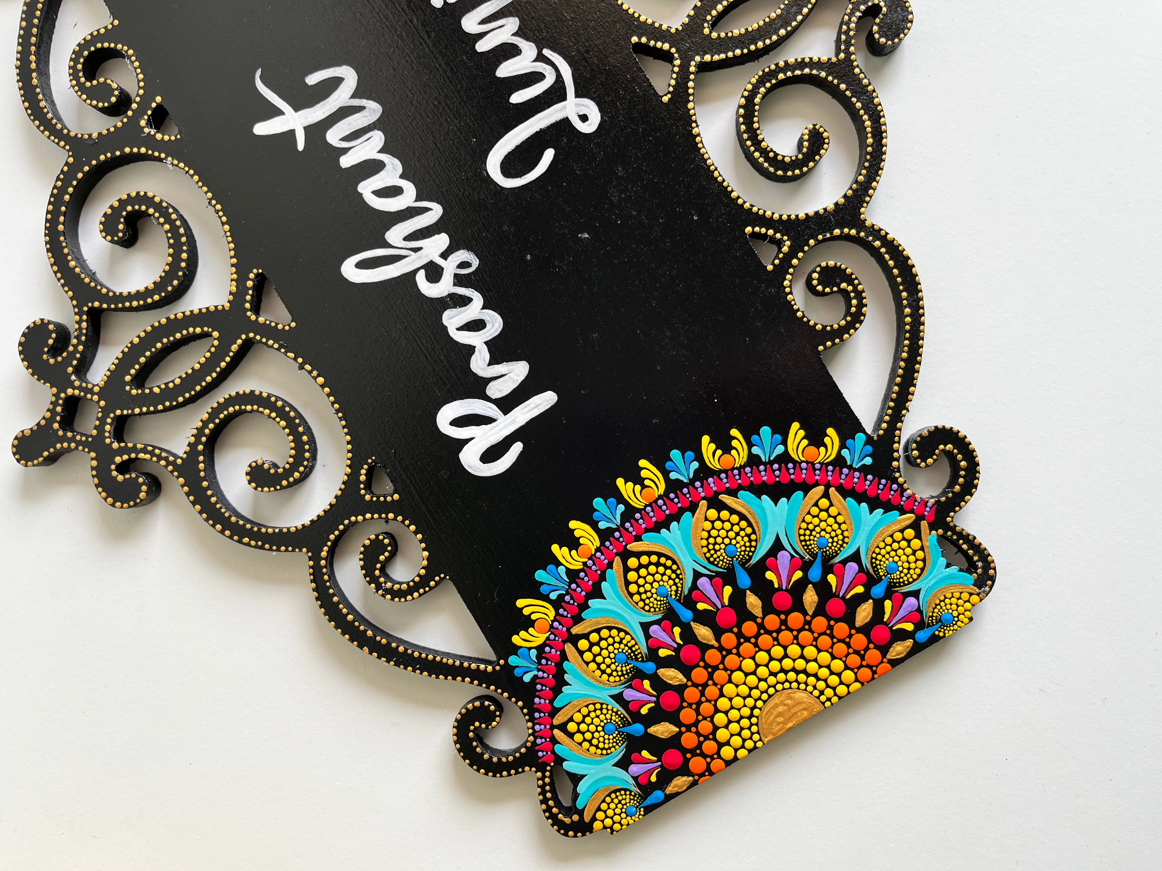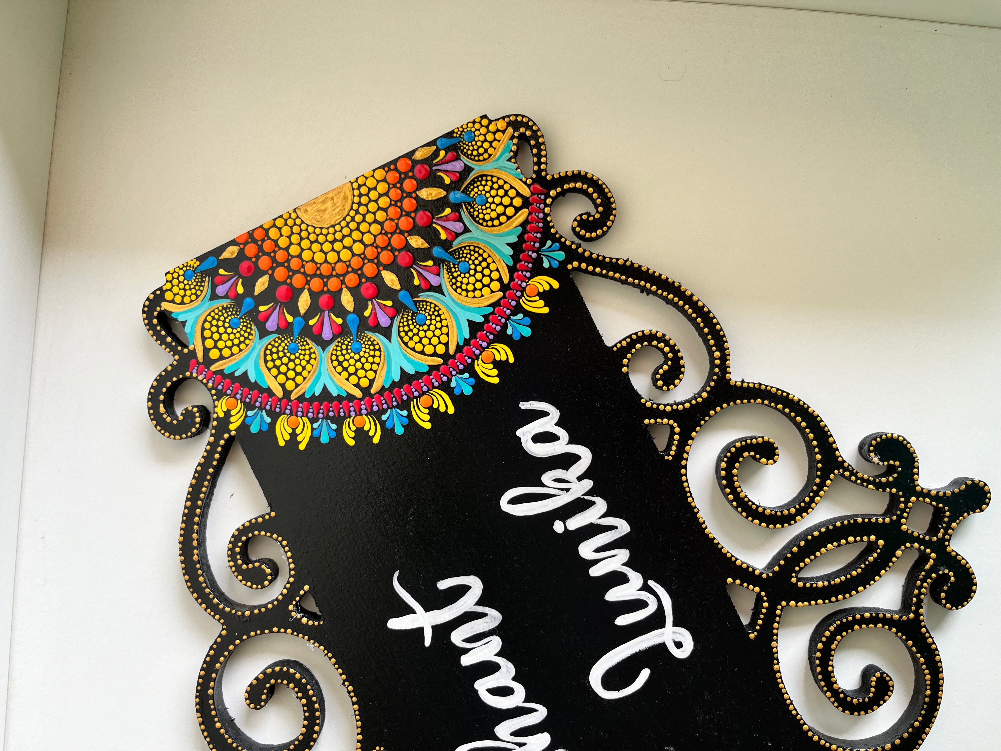 Make a bold and beautiful first impression with this Black & Gold Accented Cutwork Nameplate with Colorful Dot Mandalas – a celebration of colors, culture, and craftsmanship.