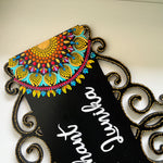 Hand-painted on a sturdy wooden base with an intricately carved cutwork frame, this design features two striking semi-circle mandalas in rich shades of yellow, teal, orange, and gold.