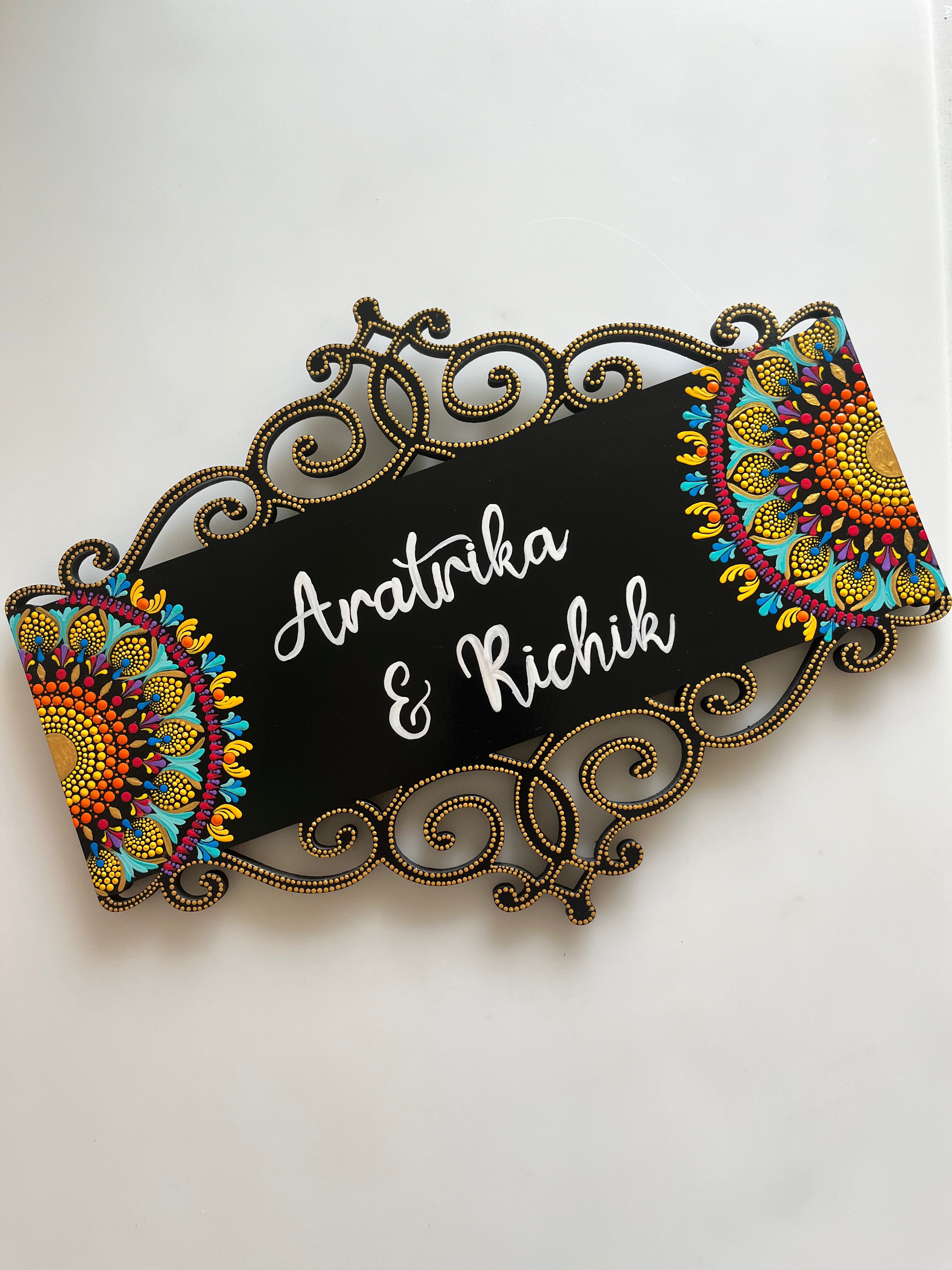 Black & Gold Accented Cutwork Nameplate with Colorful Dot Mandalas