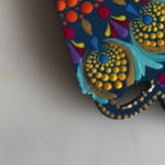 Crafted on a sturdy MDF wood base with an ornate scrollwork frame, this design showcases two semi-circle mandalas in vibrant tones of yellow, orange, teal, and gold that glow beautifully against the rich turquoise backdrop.