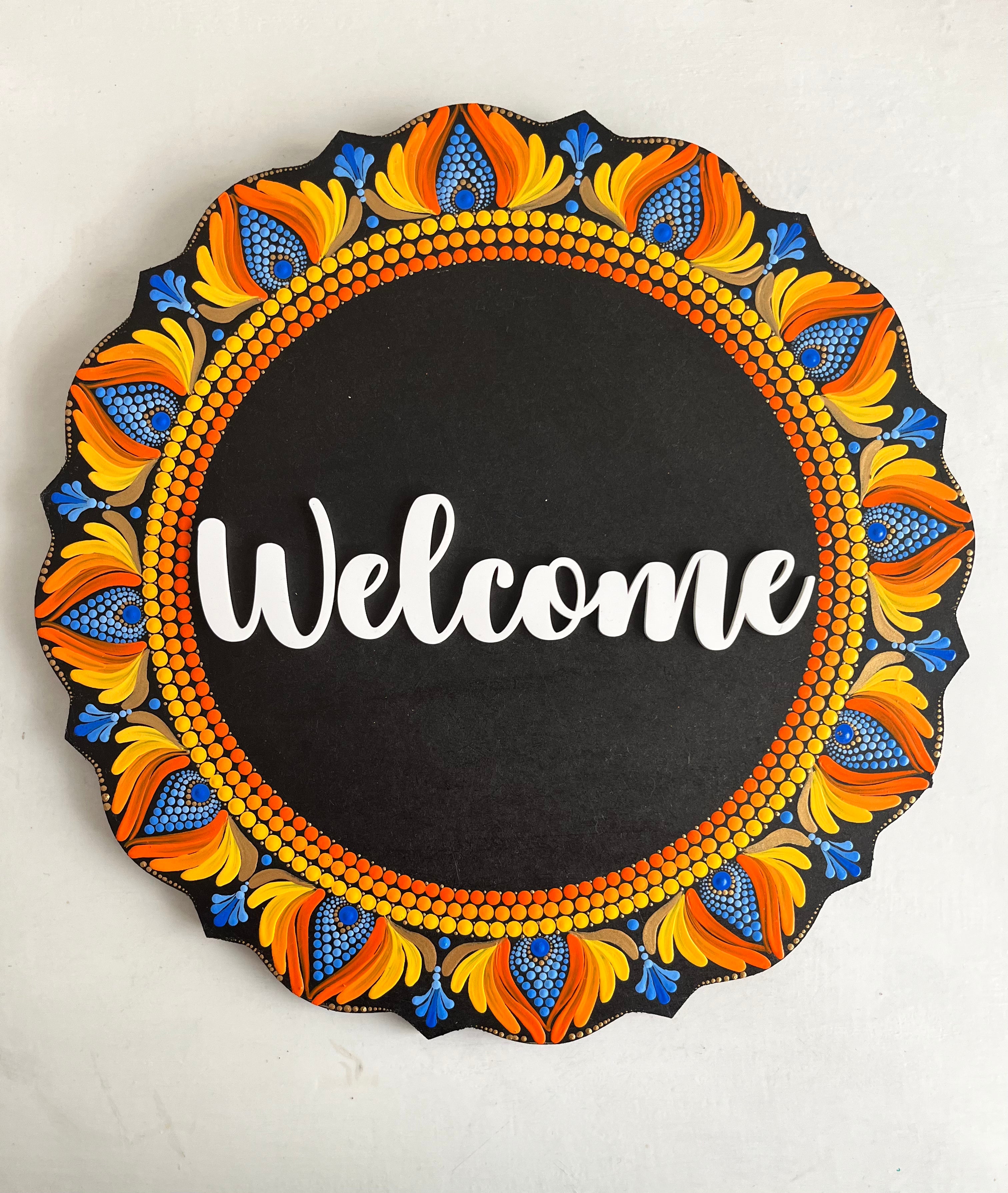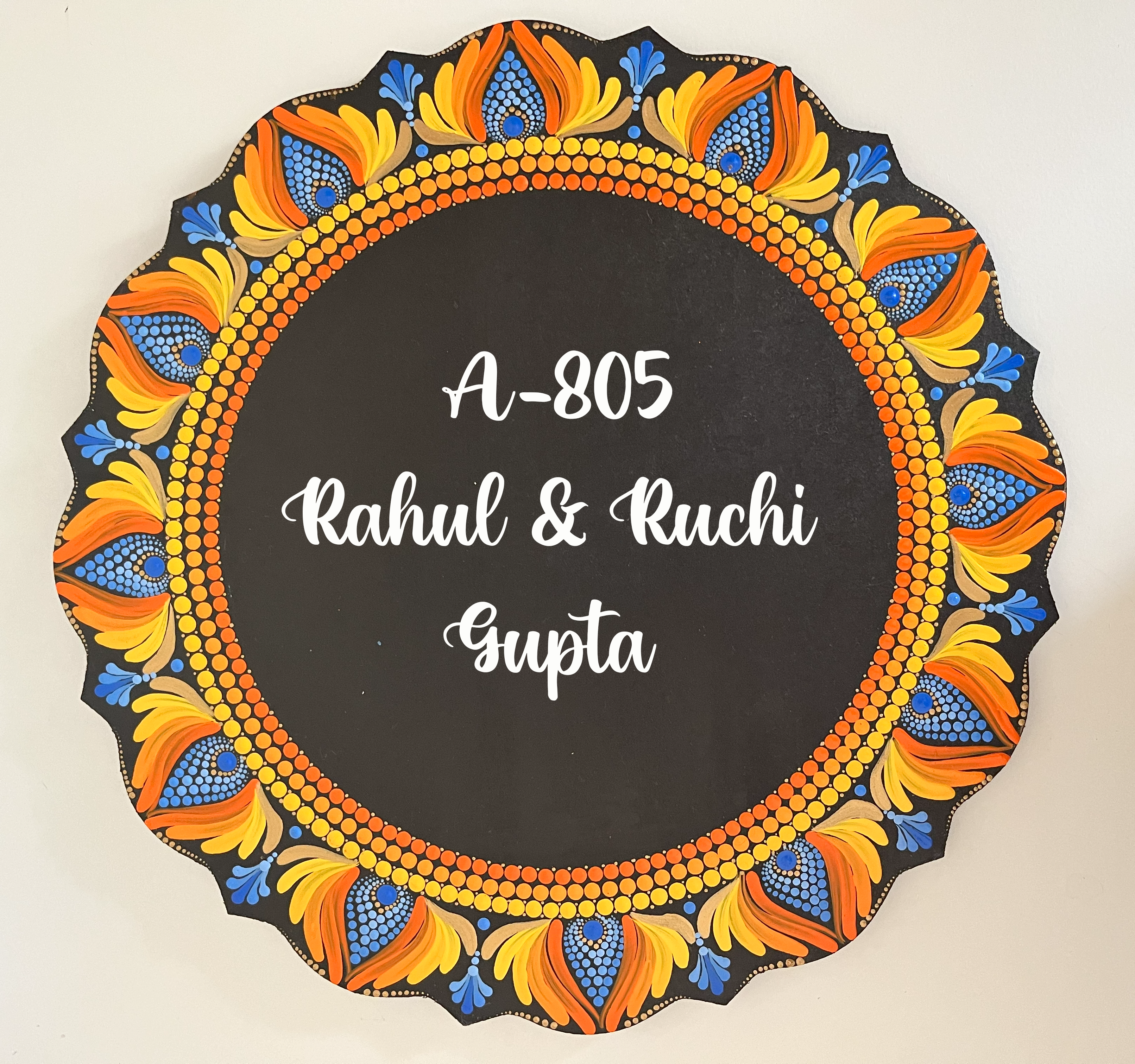Crafted on a sturdy MDF base, this 12-inch circular nameplate features intricate dot mandala patterns in radiant shades of yellow, orange, gold, and white, set against a rich dark background. The symmetrical design radiates warmth and positivity, perfectly framing your family name or house number. Each piece is varnish-sealed for water resistance, ensuring it retains its beauty for years to come.