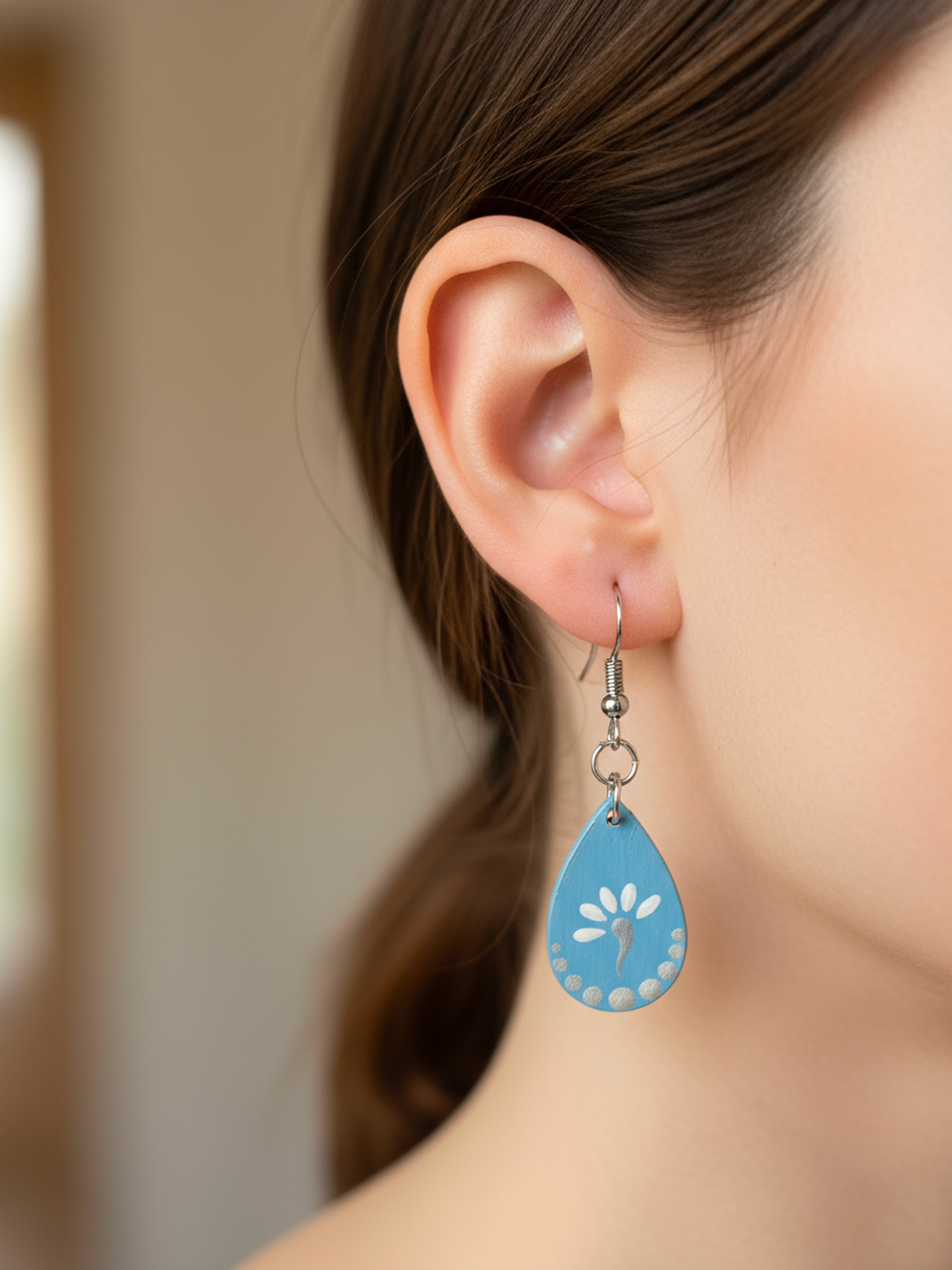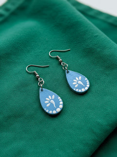 Subtle, Chic, Soulful. These Sky Blue Drop Earrings are a perfect blend of calm and creativity. Hand-painted in delicate white dot mandala motifs on a soothing sky-blue base, each teardrop earring reflects serenity and mindful artistry.
