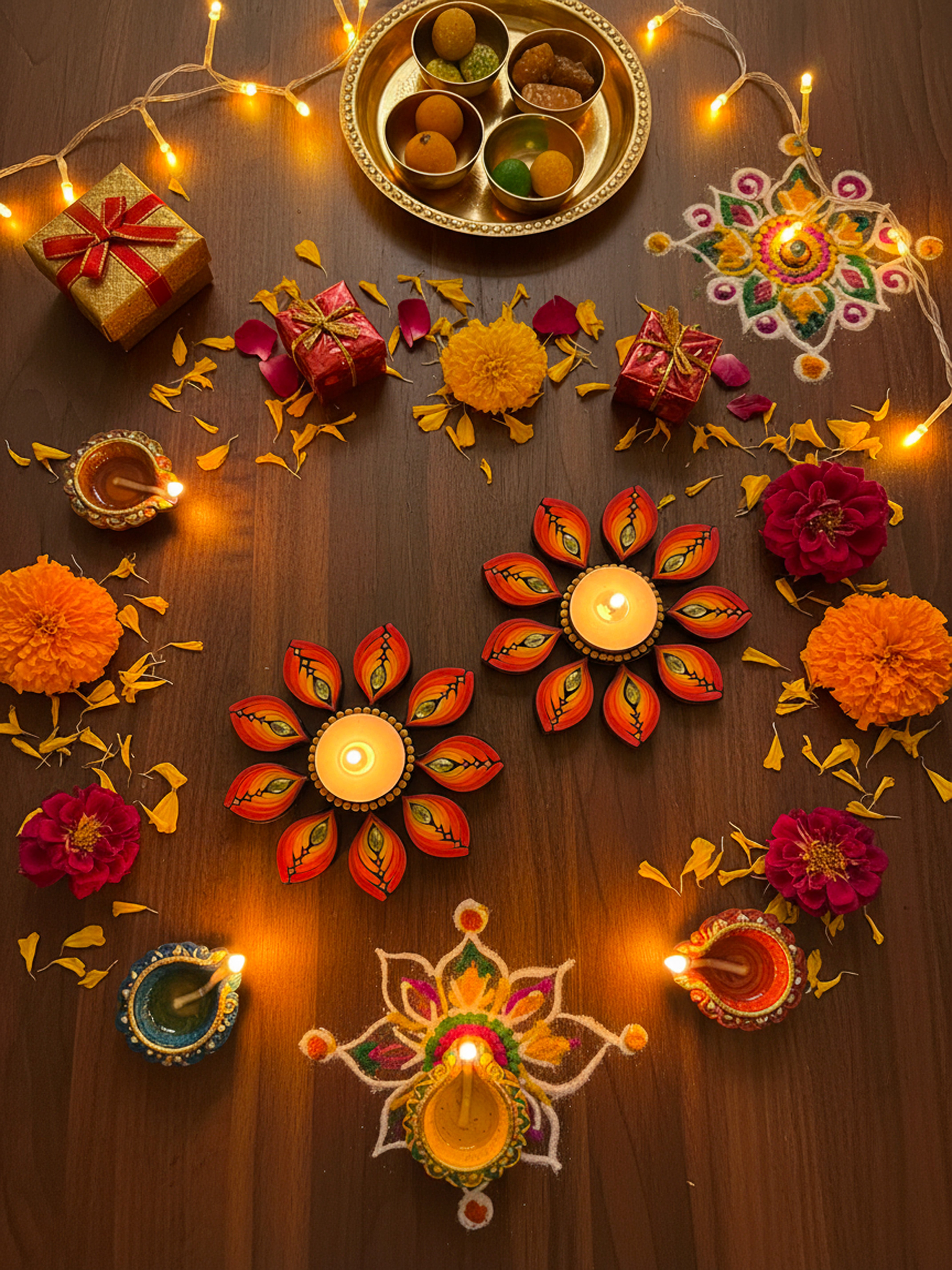 Each petal features hand-detailed patterns highlighted with subtle golden stones, adding a luminous sparkle when the tealight glows. Perfect for Diwali décor, festive tablescapes, or mindful corners, these pieces bring art, light, and harmony together beautifully.