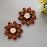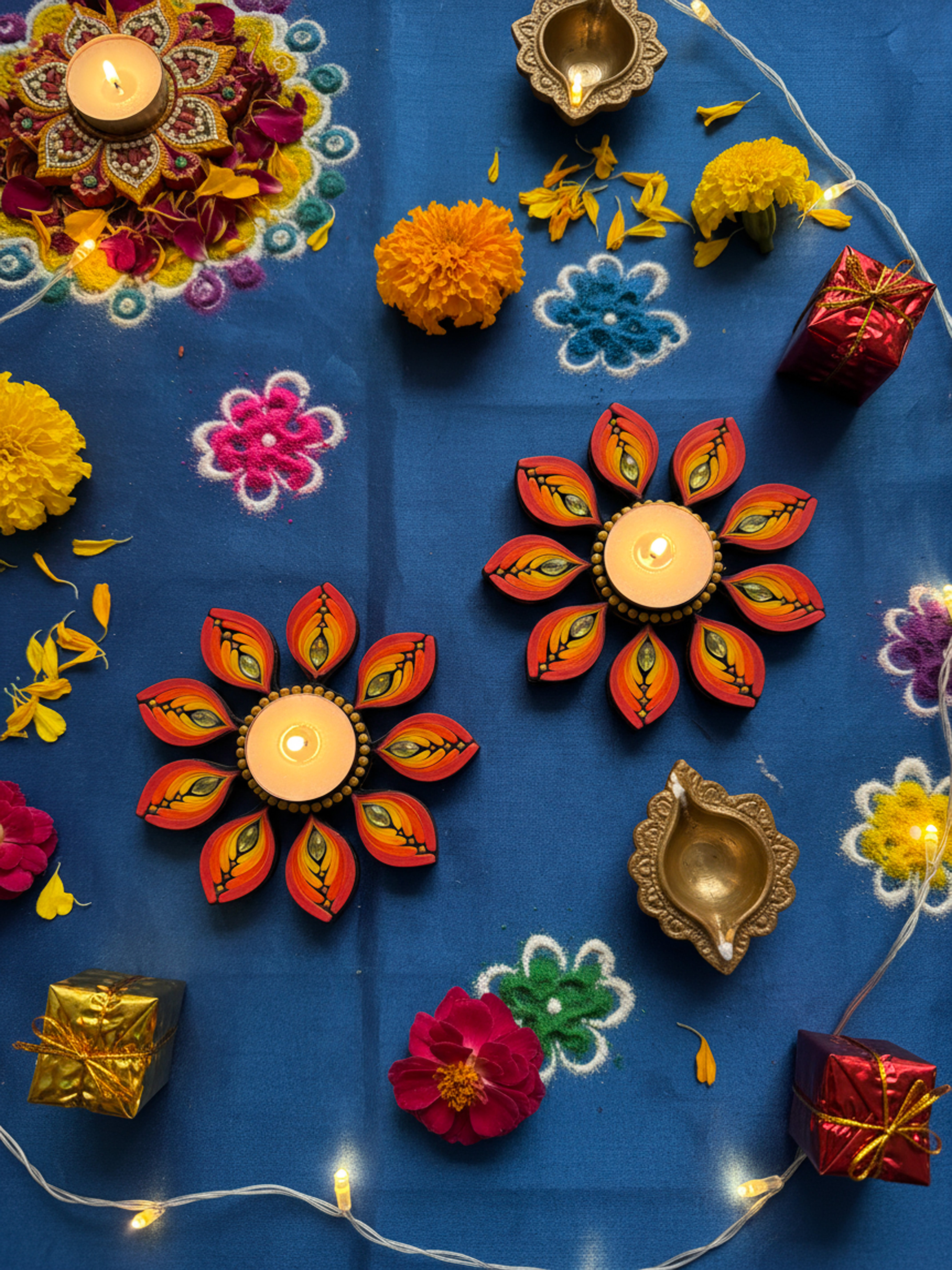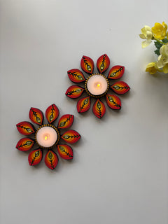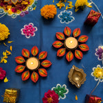 These hand-painted floral tealight holders capture the energy of fire and the warmth of festivity in every petal. Crafted on MDF using the intricate dot mandala technique, the design blooms in vibrant tones of red, orange, and yellow, symbolizing light, passion, and joy.