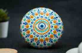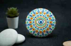 Infused with symbolism and serenity, the Turkish Eye Mandala Stone brings together protection and artistry in perfect harmony. Inspired by the traditional Evil Eye (Nazar) motif, this unique handpainted stone radiates calm energy through soothing blues, turquoise, and gold tones each dot representing layers of mindfulness and intention.