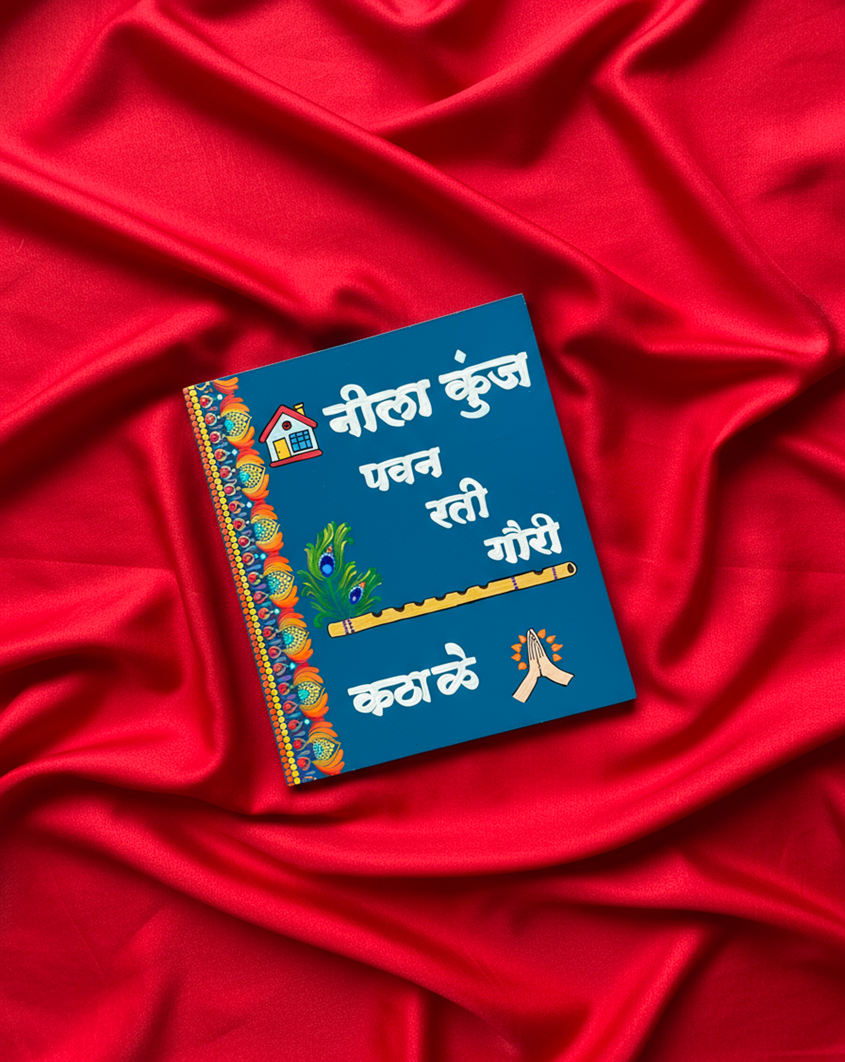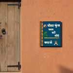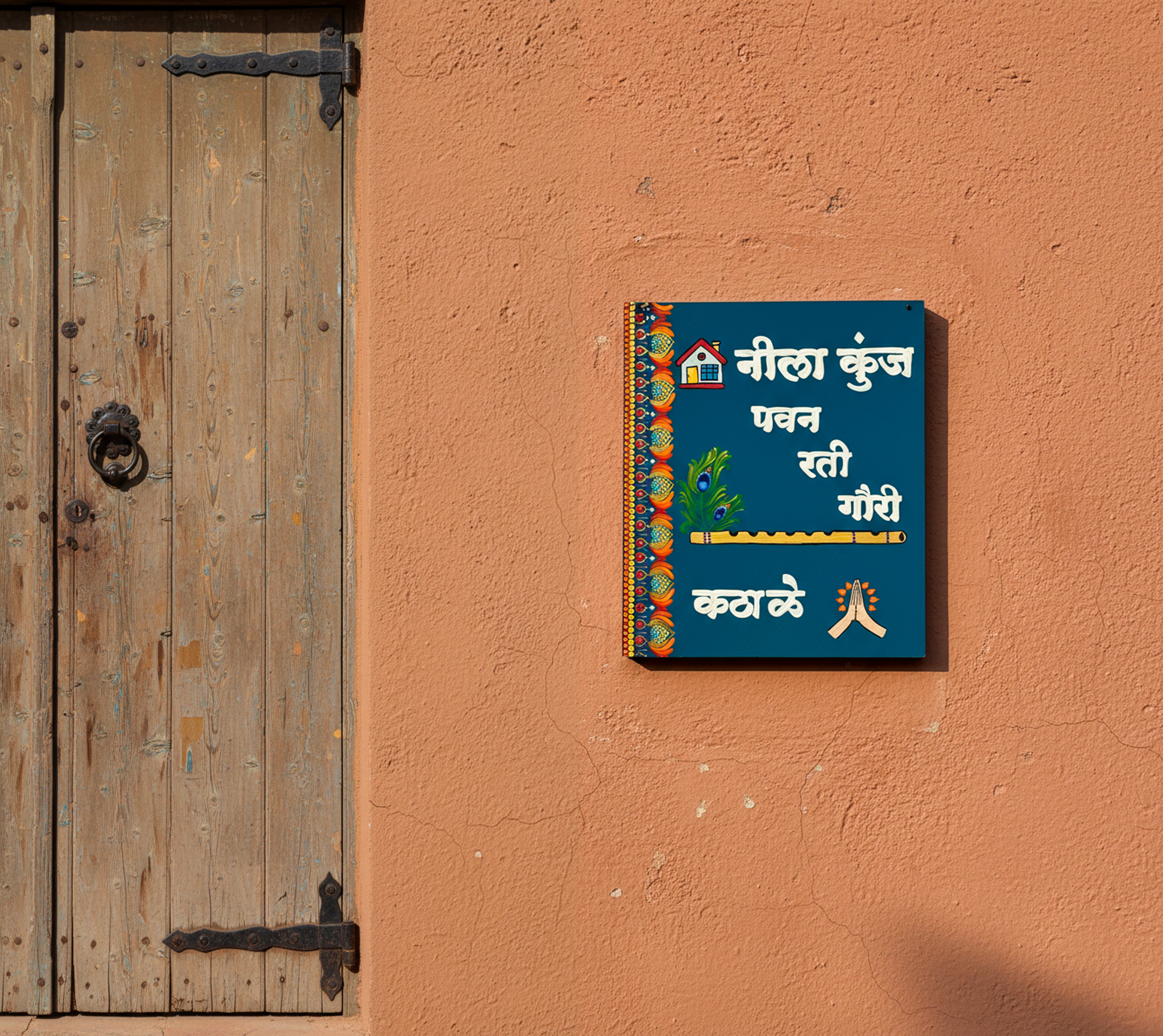 This stunning hand-painted wooden nameplate is designed with traditional dot mandala art along the border, adding a vibrant touch of color and elegance. The background is painted in a deep teal shade, with names inscribed in Marathi script for a personalized touch. Adorned with symbolic artwork including a flute, peacock feather, folded hands, and a home icon, this piece beautifully blends art with cultural motifs. Perfect for welcoming guests, it adds warmth, positivity, and uniqueness to any entrance.