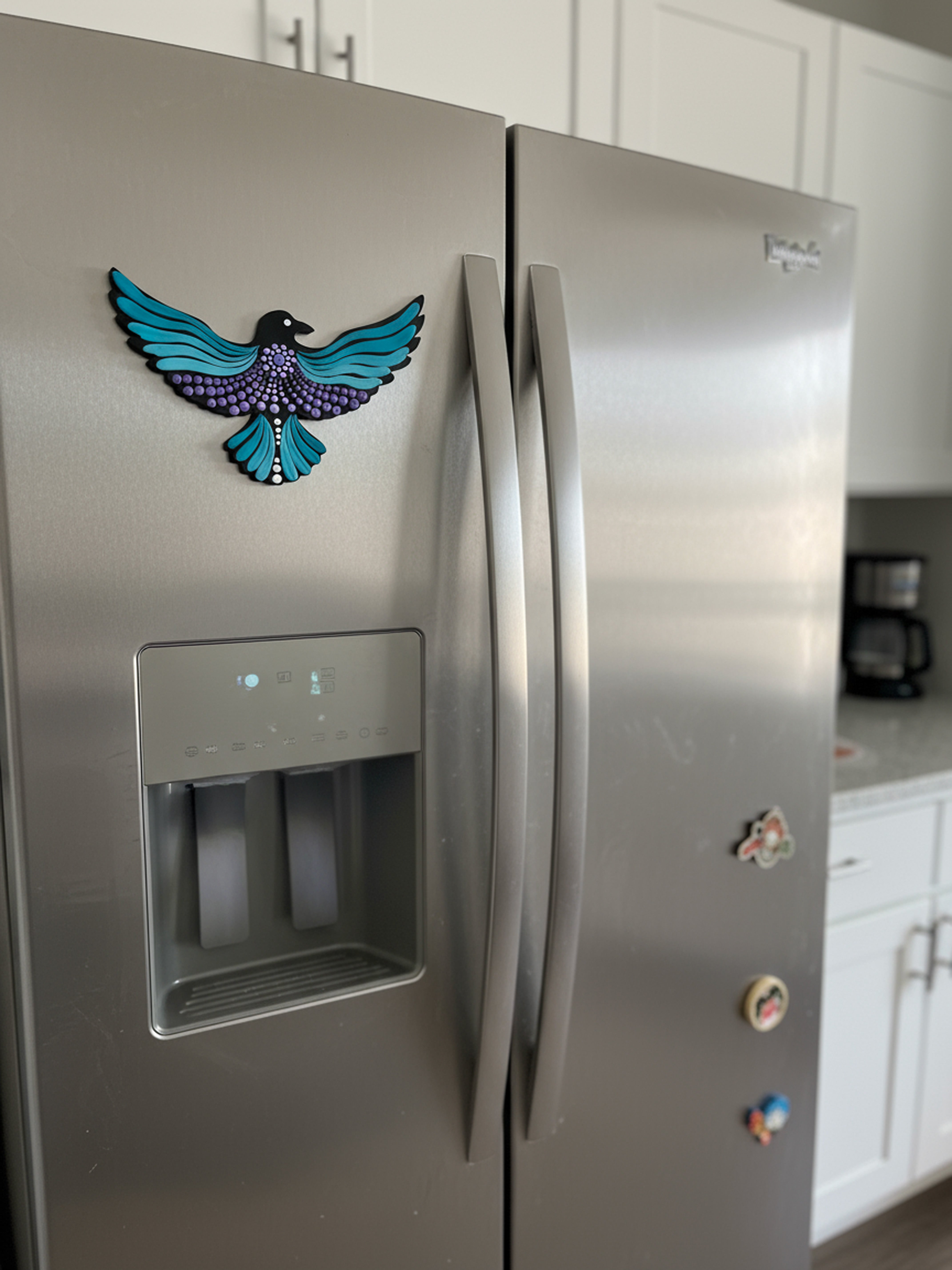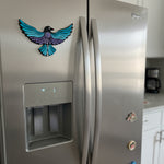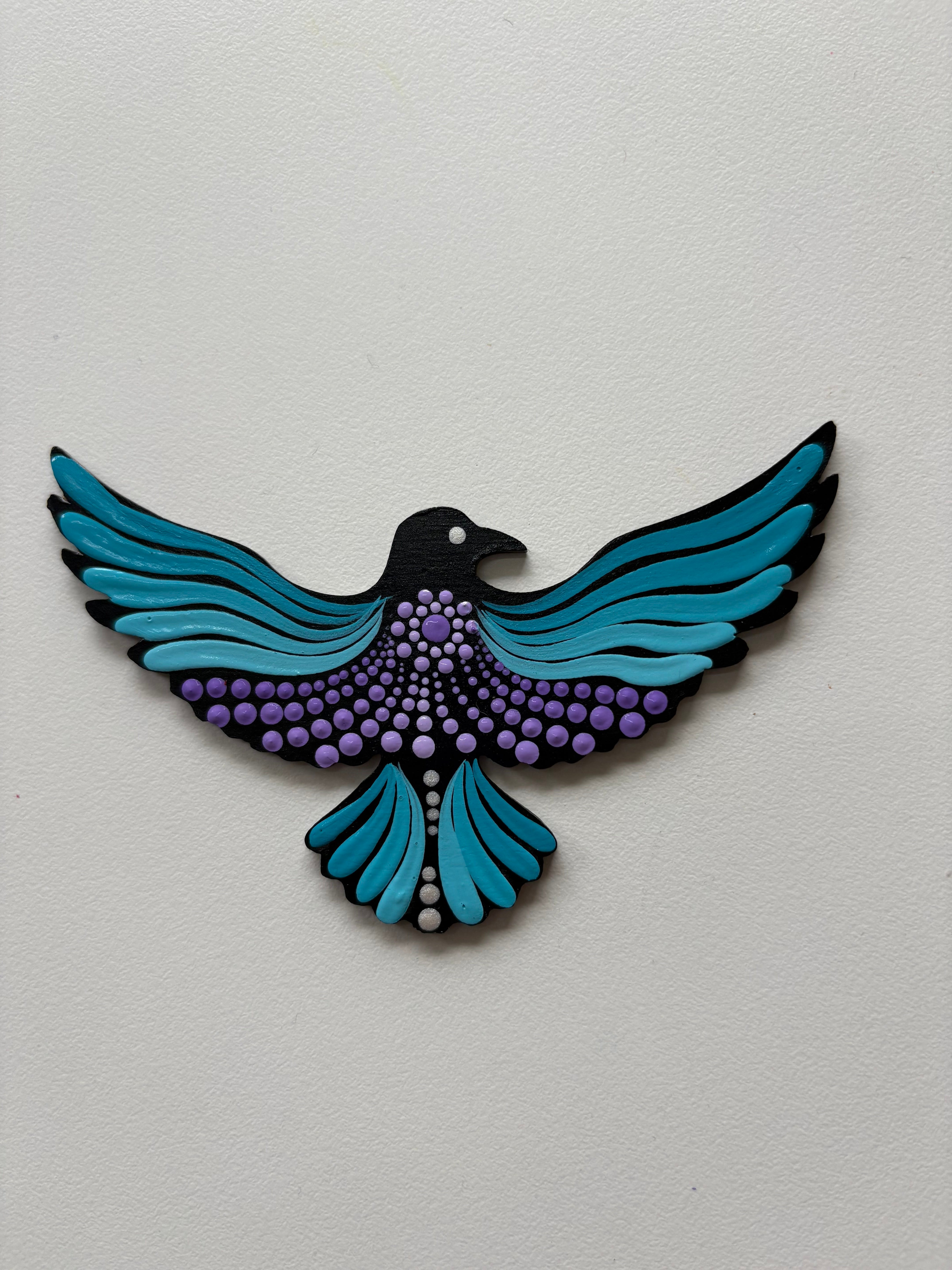 This hand-painted bird magnet captures the beauty of freedom and serenity through dot mandala art. The design features elegant wings painted in shades of turquoise blue and lavender, symbolizing calmness, creativity, and spiritual balance. Each dot and brushstroke is meticulously hand-done on MDF, creating a sense of harmony and motion.