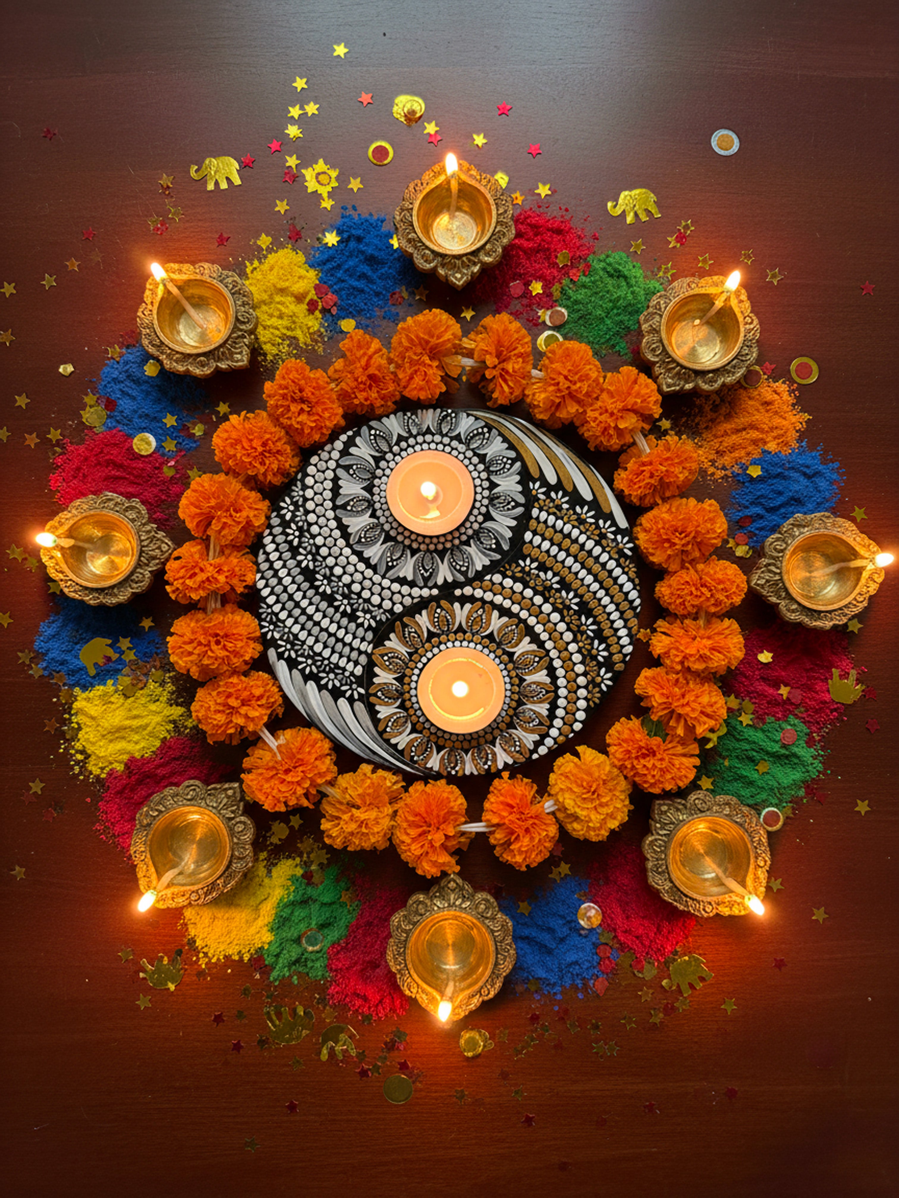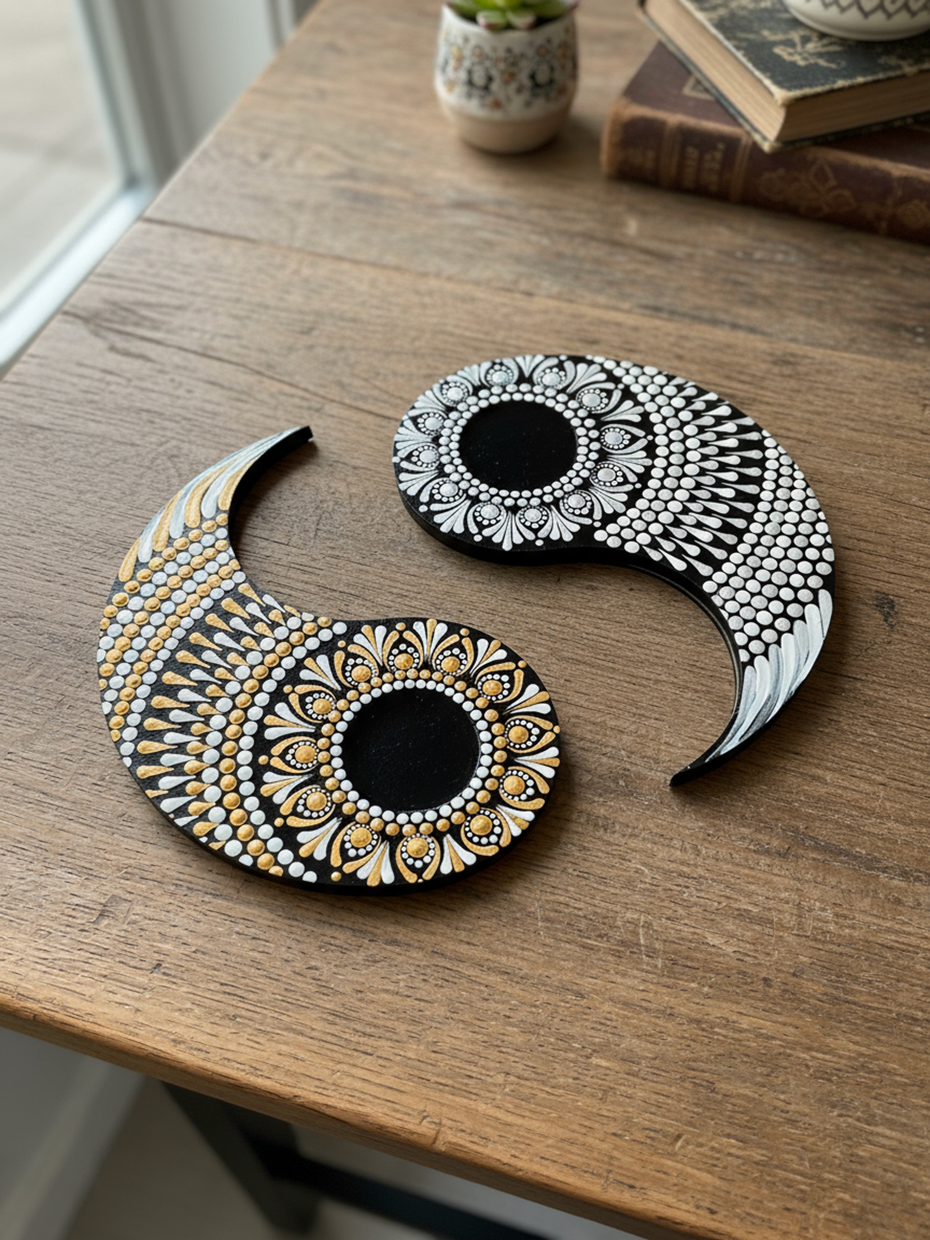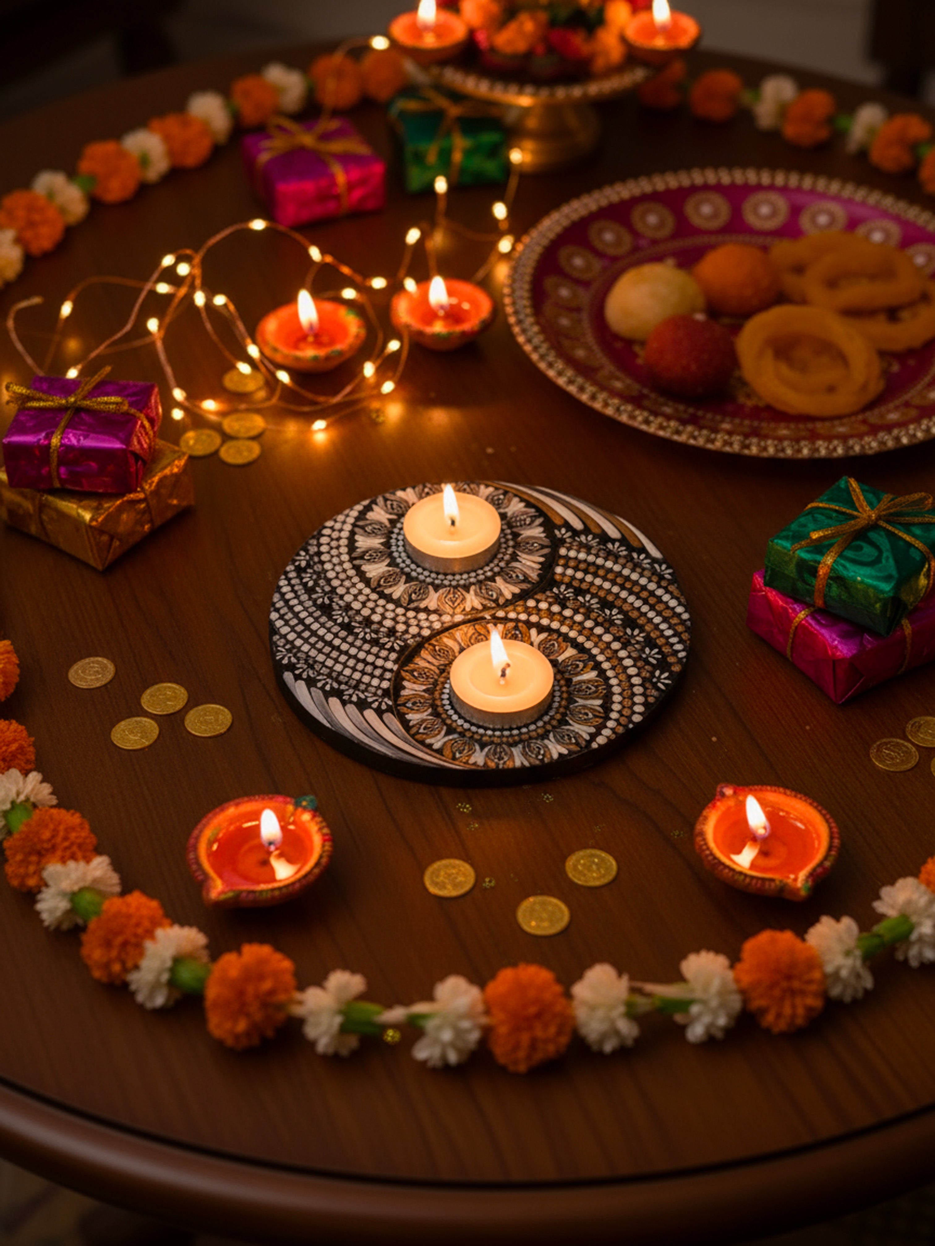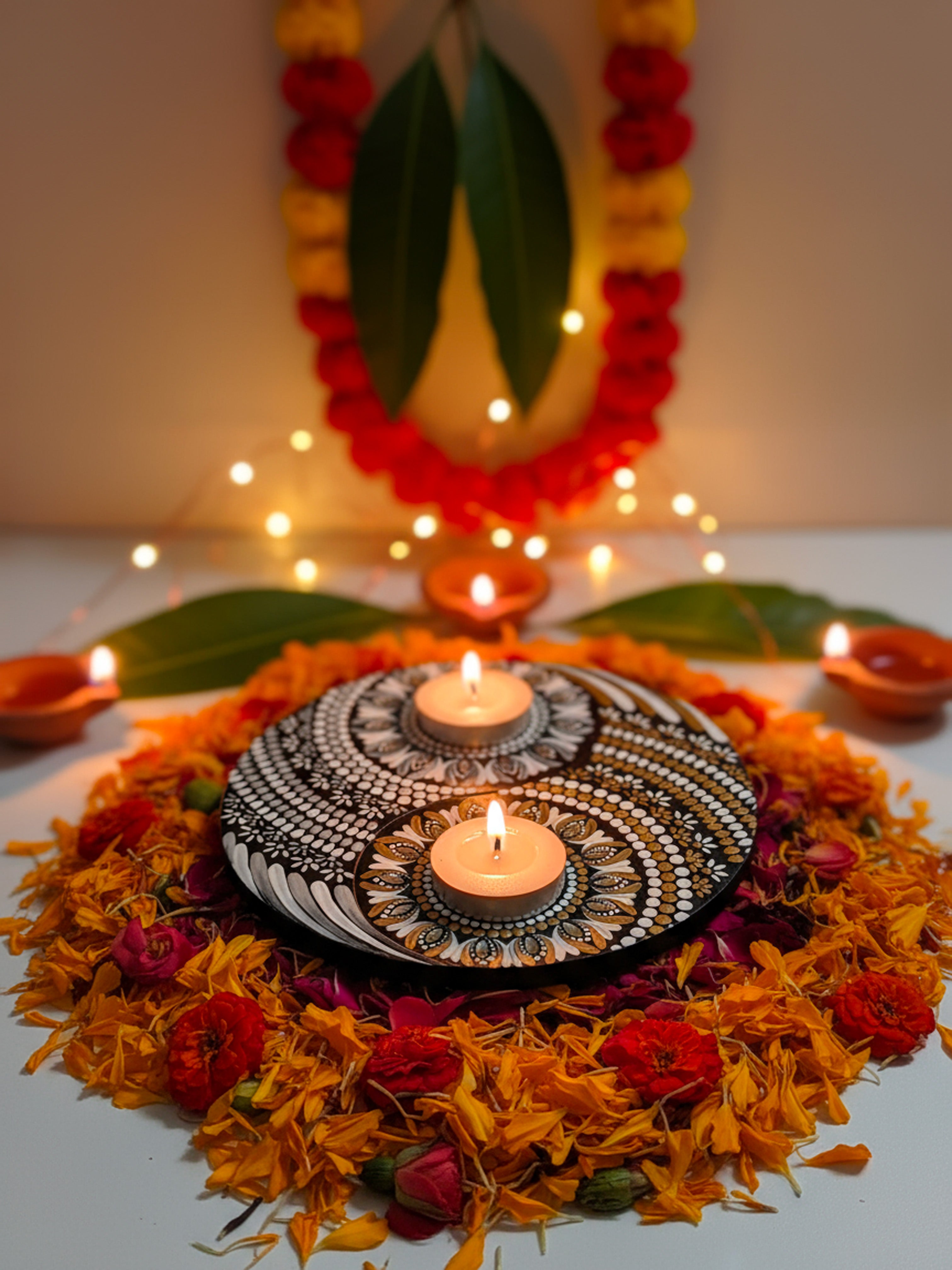 Experience the perfect harmony of light and shadow with this elegant Yin Yang Mandala Dot Art Tealight Holder. Hand-painted on MDF using the traditional dot mandala technique, this design beautifully symbolizes the balance of duality calm and energy, light and dark, feminine and masculine.