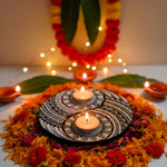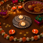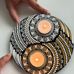 The intricate black, white, and gold detailing enhances its sophistication, while the twin tealights radiate a soft, meditative glow, making it ideal for home décor, spiritual spaces, or as a thoughtful handmade gift.